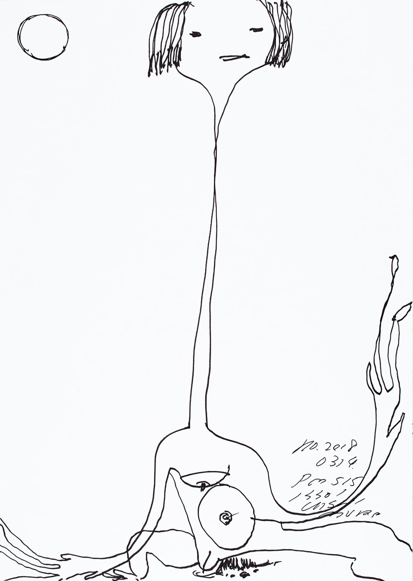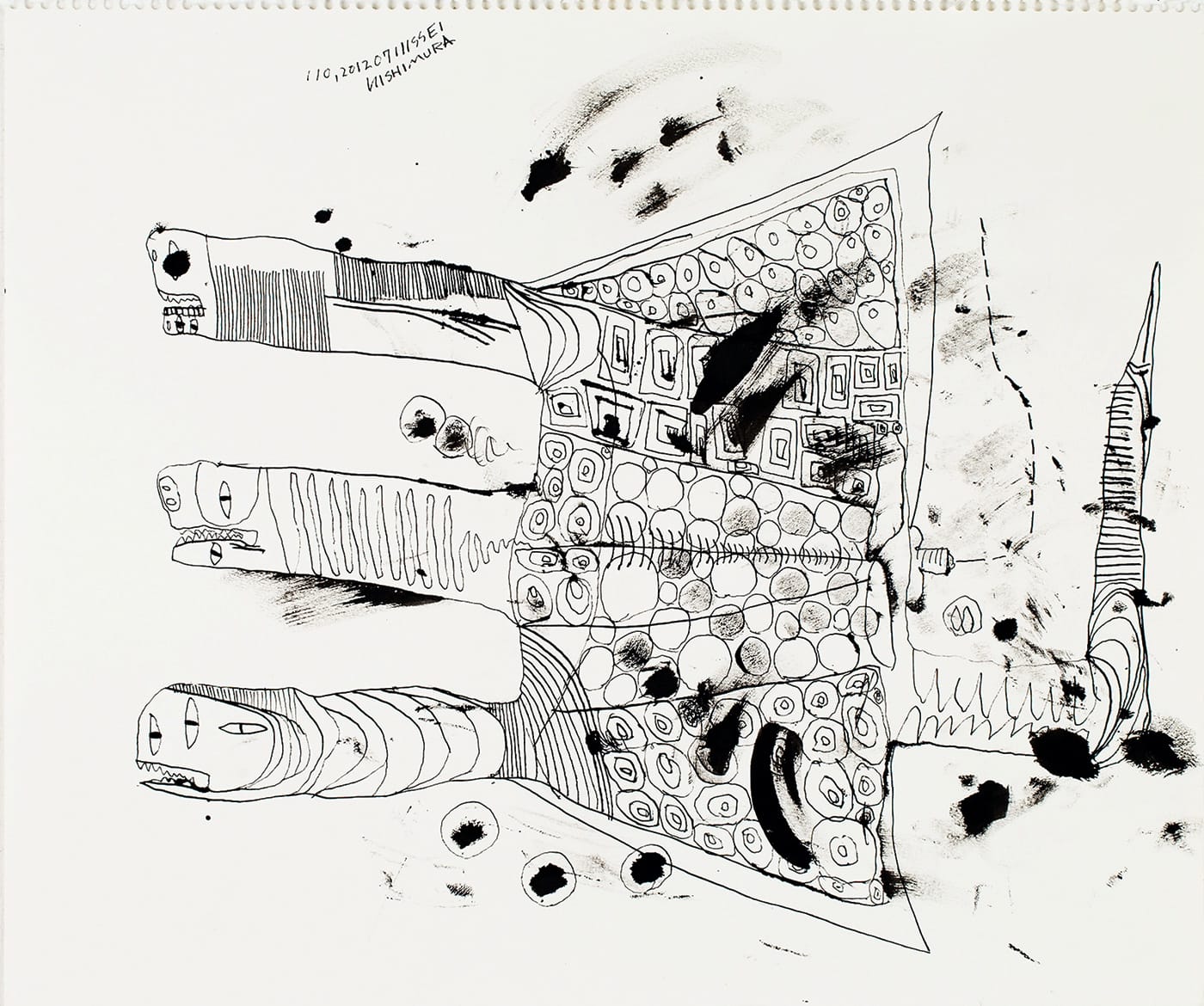 In other drawings in ink on paper or paperboard, Nishimura obscures faces or body parts in thickets of dense, wiry lines, or he depicts mysterious, toothy creatures that appear to emerge from a common body or share a common tail. (Japanese viewers may recognize their inspiration in monsters from Godzilla stories.)
