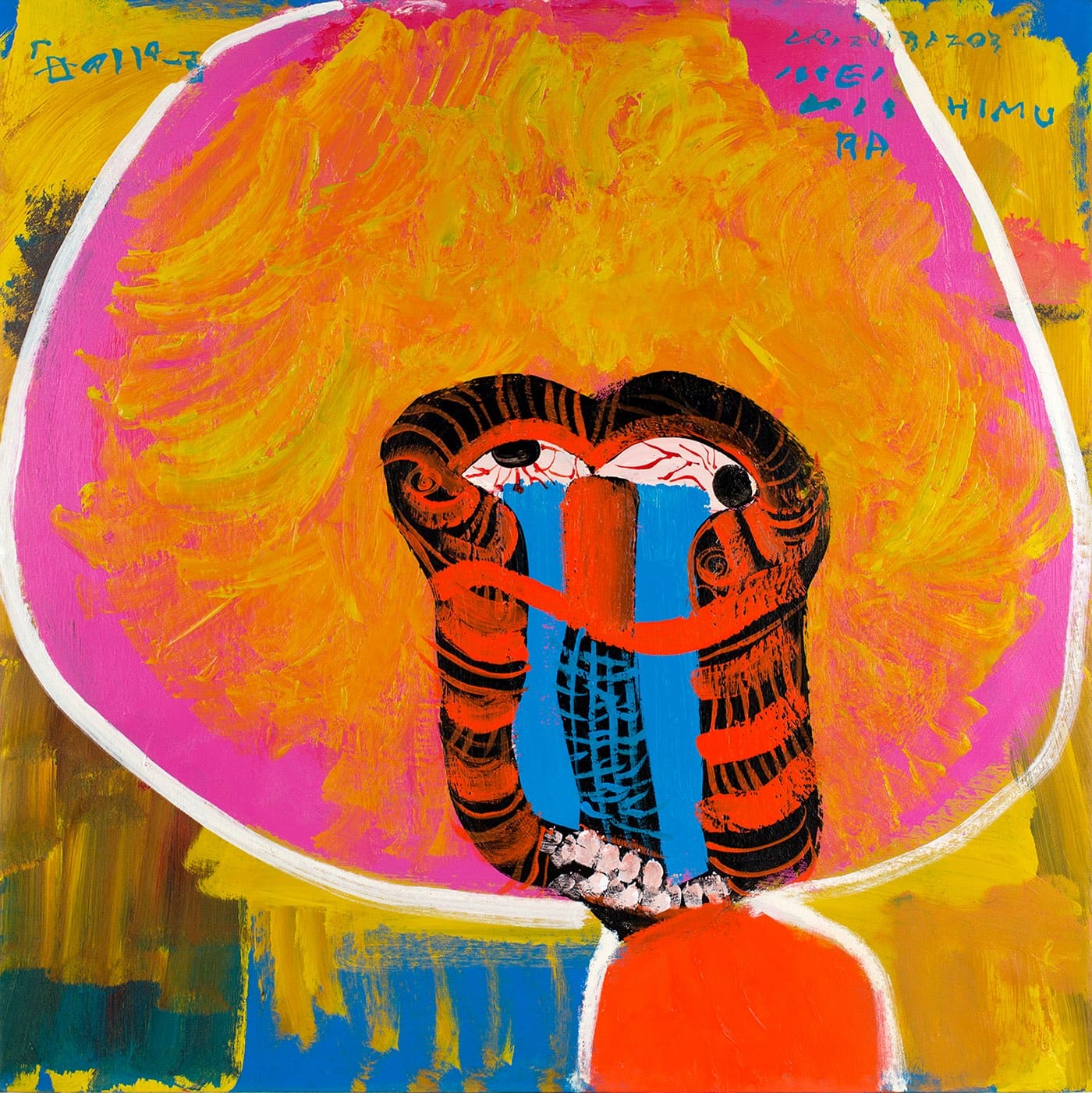 In “My Mother’s Permed Hair” (2013, acrylic on fabric, mounted on plywood), a voluminous, yellow-pink coif surrounds a distorted, abstracted face that would have made the Surrealists proud. In fact, Miyawaki told me, Nishimura made this painting one day right after his mother returned from a beauty parlor, where, for the first time in many years, she had had her hair permed, a change in appearance that shocked her son.