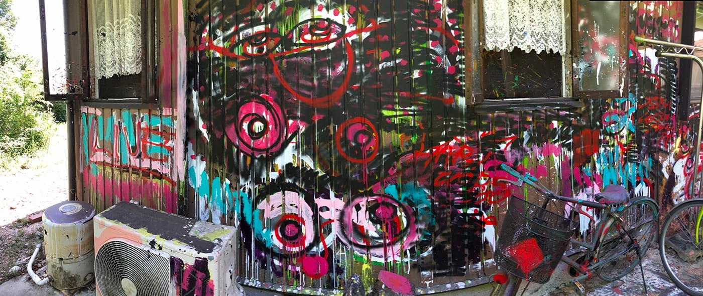 Nishimura was born in 1978 in Aichi Prefecture, in south-central Japan. Today, he lives with his parents in their family home in the hills on the edge of Nagoya, a commercial-industrial city that is Aichi’s capital. There, Nishimura keeps a modest studio space that spills out into a garden, in which he has painted the rocks of a stone path and even some sides of the house.
