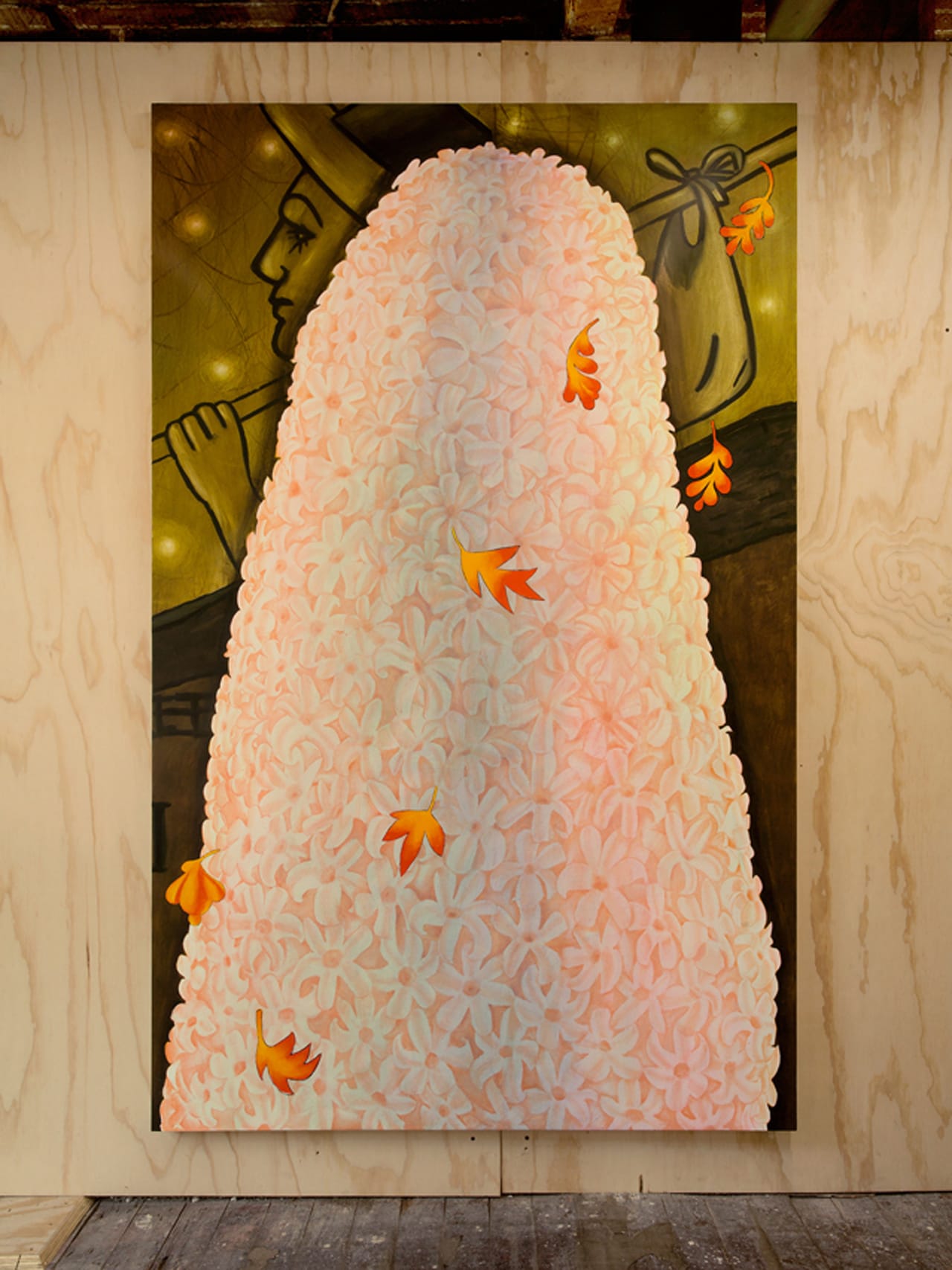“The Infinite, the Gold, and the Deathless West” can be considered to sum up all five paintings. The traveller is again obstructed, but isn’t stationary this time. She seems captured as if in a snapshot, about to exit the scene for good. Between the traveller and the viewer is a mound of blooming flowers. Paradoxically, orange autumnal leaves fall in front of the mound. Both spring and fall are referenced here. The traveller is in a lightly starry sky that could be dawn or dusk. This painting seems to condense time into one image, the traveller eternally journeying.