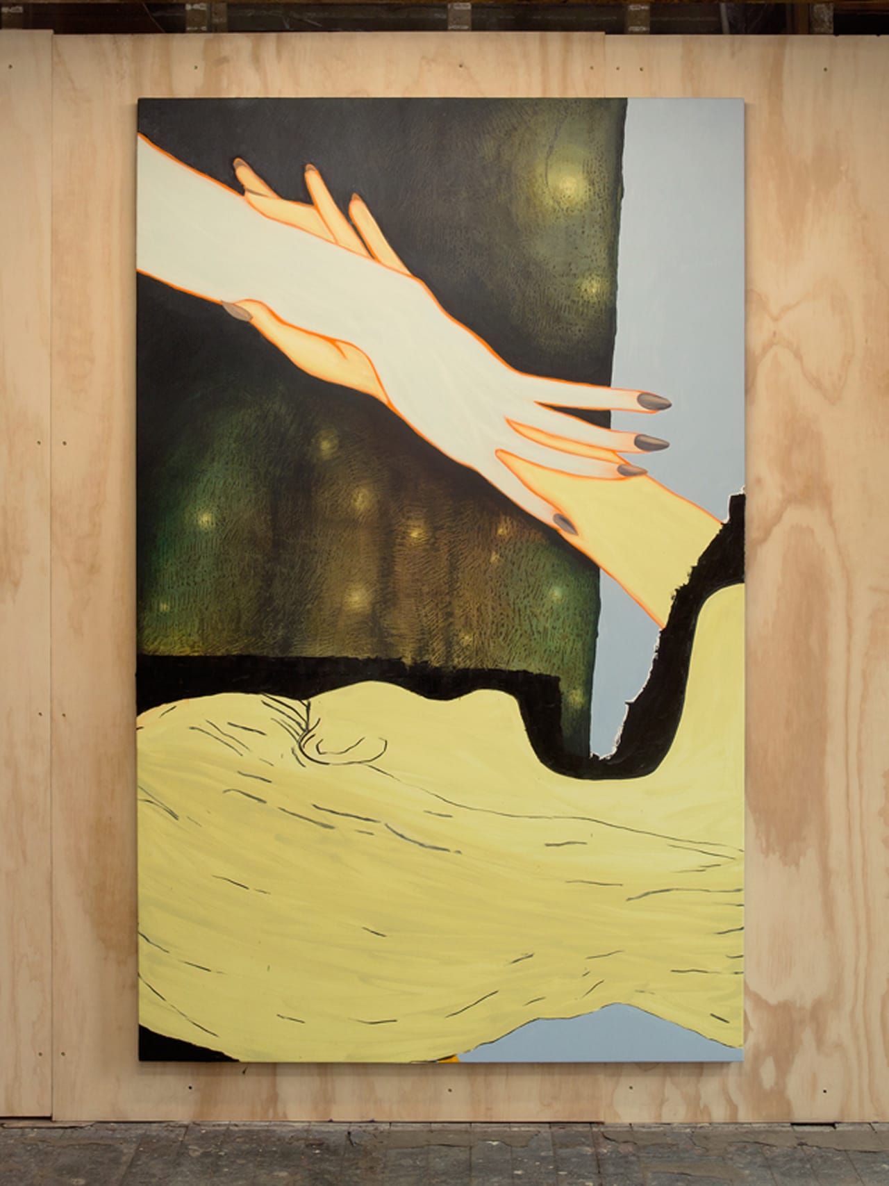 Another painting, “These Are Pearls That Were Your Eyes,” could be a crop of a still from an older Sally Cruikshank animation. The delicate, stylized fingers of two reaching hands are evocative of this, their thin outlines and swooped forms begging to animate. Here the diagonal arms grasping and touching move the entire composition. The solitary, yellow traveller seems to be making a connection with another person on her journey. However, there’s something about the soft, frail gesture that gives it a feeling of hesitation and possible mistrust. Isn’t the stranger’s arm the same mirrored arm that is reaching to it, only rendered a different color? This is the only painting of the five that features another character, and it is unsettling. The solipsism may not be broken by this hallucination on the road.