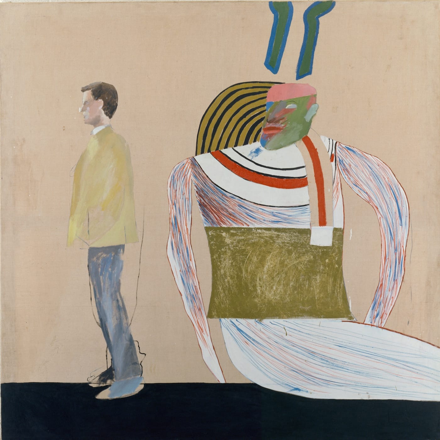 He dabbles in abstraction for a while, though the shapes are often easily recognizable as phalluses. In “We Two Boys Together Clinging” (1961), words helter-skelter around two gently swaying lollipops. We feel that Hockney is yearning, all the time, to be embodying lived experience, and so it is not at all surprising that the most important work by him in this show is a portrait of his father sitting in the presence of what looks like a heaped-up pyre of abstract motifs — are they cones? — that could be out of Léger or early Picasso. This is clearly a bonfire of the vanities, and its title is “Portrait Surrounded by Artistic Devices” (1965).