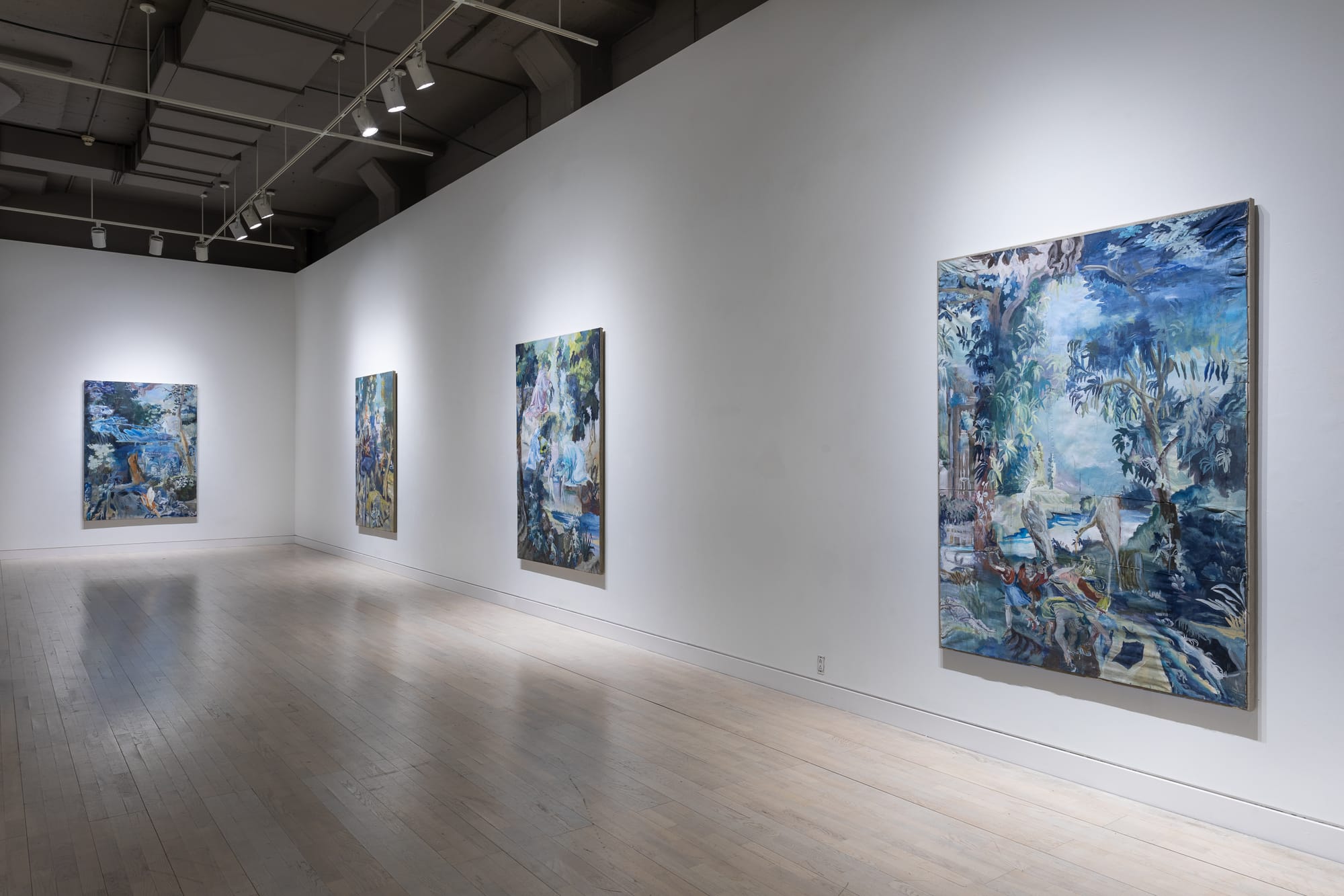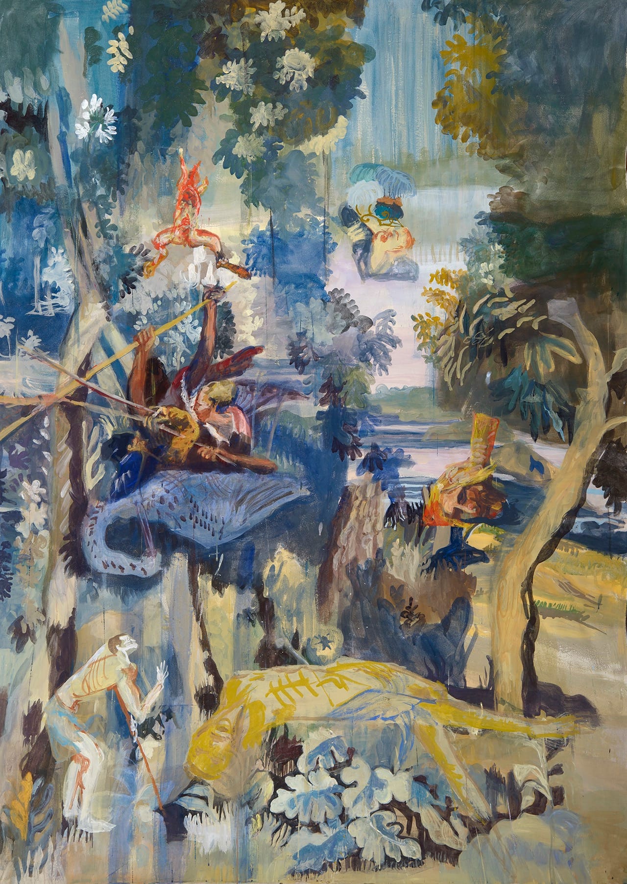 For most works in the Winter Soldier Series (Tapestry Paintings) (2020), included in Jane Irish at Locks Gallery, she painted with a combination of distemper and oil. Prone to fading, distemper fell out of use after the Renaissance. Oil, on the other hand, has a longer shelf life. Irish wisely puts these characteristics to visual and conceptual use.