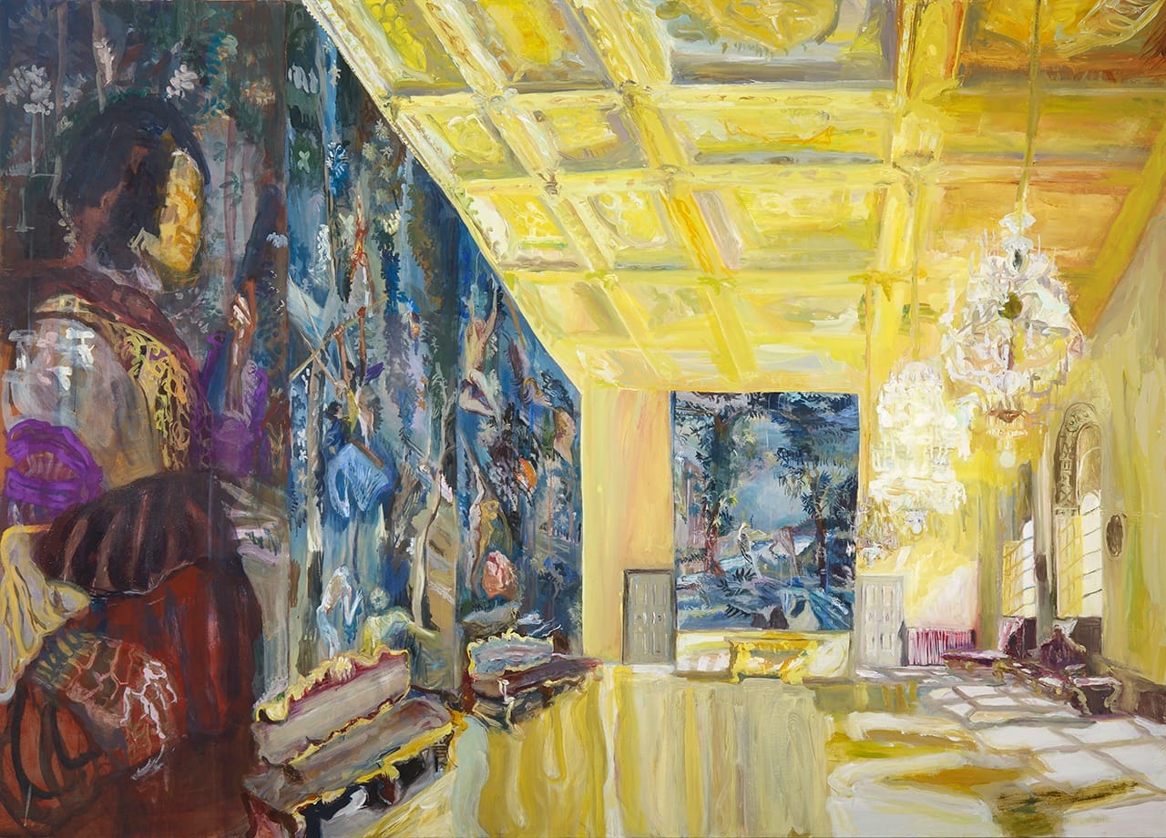 “Tapestry Hall” (2020) strikes me as a truly virtuosic work. When viewed from different angles and varied distances, the dimensions of the room in the painting seem to shift, while the yellow ceiling and reflective floor, in contrast to the dark left wall, create the dizzying feeling of being in a tunnel. Significantly, the left wall contains echos of “Interrogator” and other works from the Winter Soldier Series. In the exhibition catalogue, Irish describes her inclusion of these images: