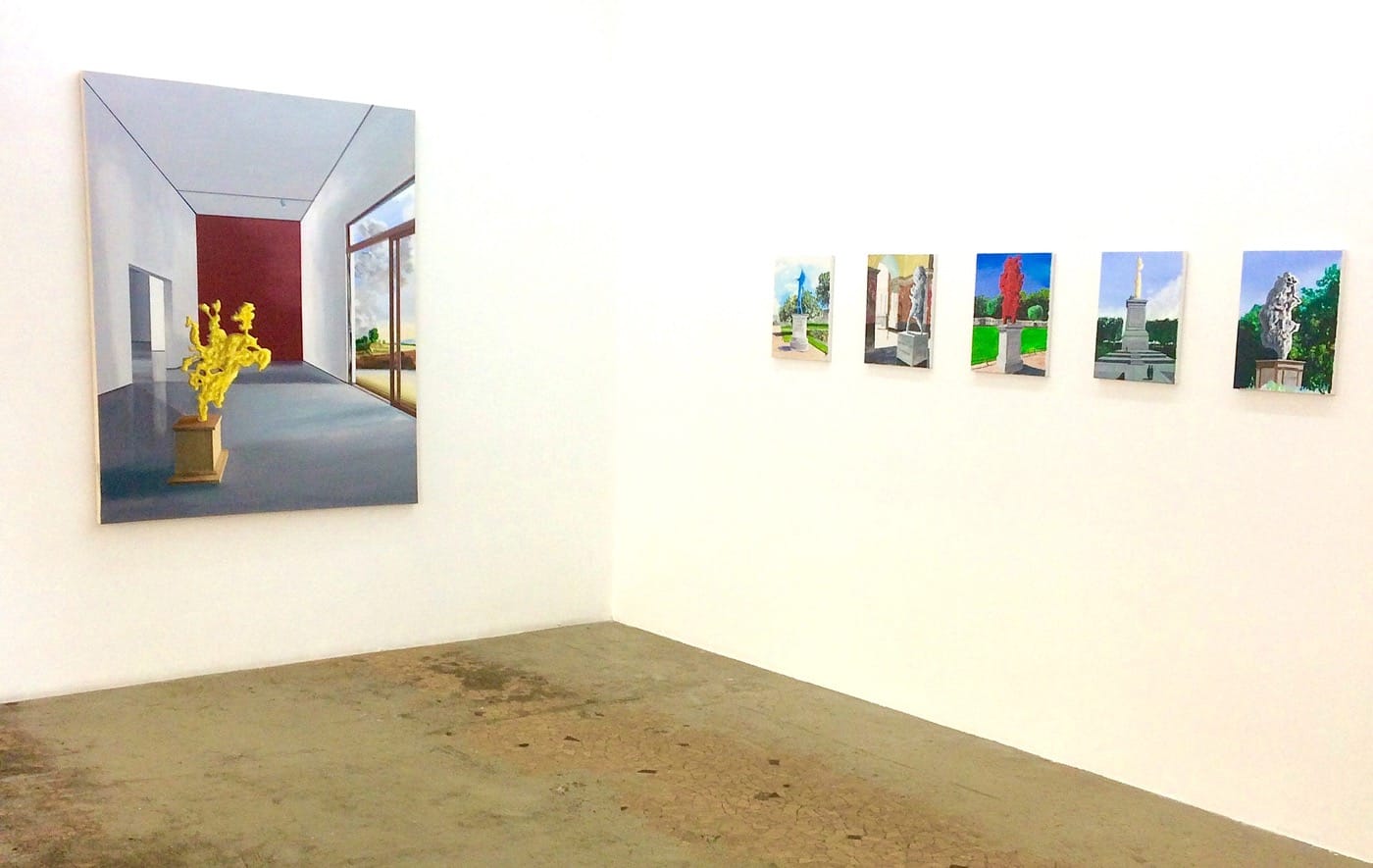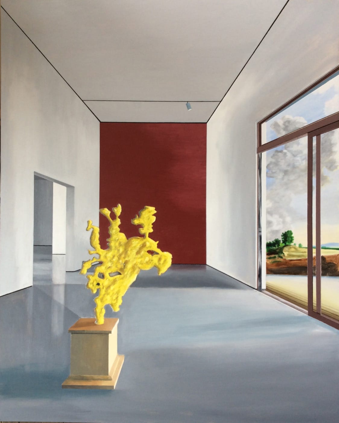 Quite curiously, Williams makes ahistorical history paintings by playing with the postmodern circulation of context-free imagery, mixing free-spirited image accumulation with glints of personal specificity. As such, he takes the piss out of painting in an emblematic way, second only to Andy Warhol. Consider Williams’s coquettish but elaborate canvas “Detail of Hommage à la jeunesse de Victorine Meurent” (2017), my favorite in the show. This painting features the rendering of a pale abstract sculpture that looks like snow-covered road-kill or the morphology of a fart. A bit more yellowish, it would evoke frozen piss. This oddly flat abstract sculpture sits on a low-pedestal near an indecipherable portrait painting, behind two diminutive horse sculptures and a buttery statuette of a woman; all set in a chic park-side penthouse. This tortured stain-shape ignobly represents Victorine Meurent, the female French painter and famous model for Édouard Manet. She appears quite brazenly nude in Manet’s swank masterpiece “Olympia” (1863).
