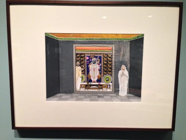 Many were made (by and) in the European convention while some demonstrated a middle ground, like those of the hybrid Company painting style that in turn influenced some nascent photographic traditions in India. But some were quite different. A royal patron might completely rework a photograph such that it throbs with color and regal distinction. Or a Hindu faithful may add devotional iconography, leaving only the head of one subject from the original painting untouched, as in “Priest and Donor Before Srinathji.”