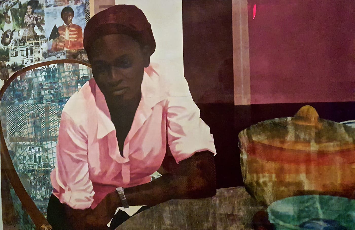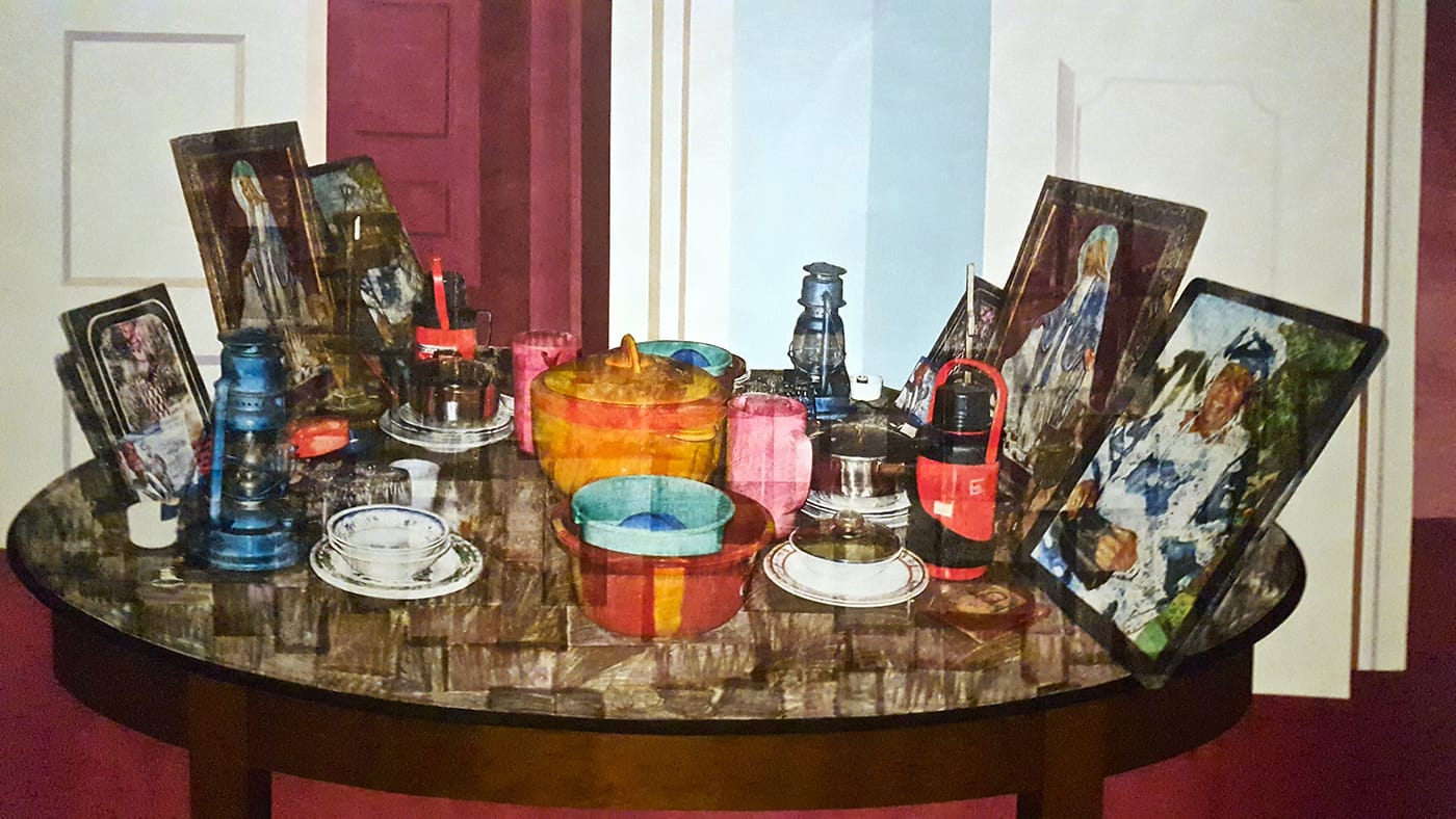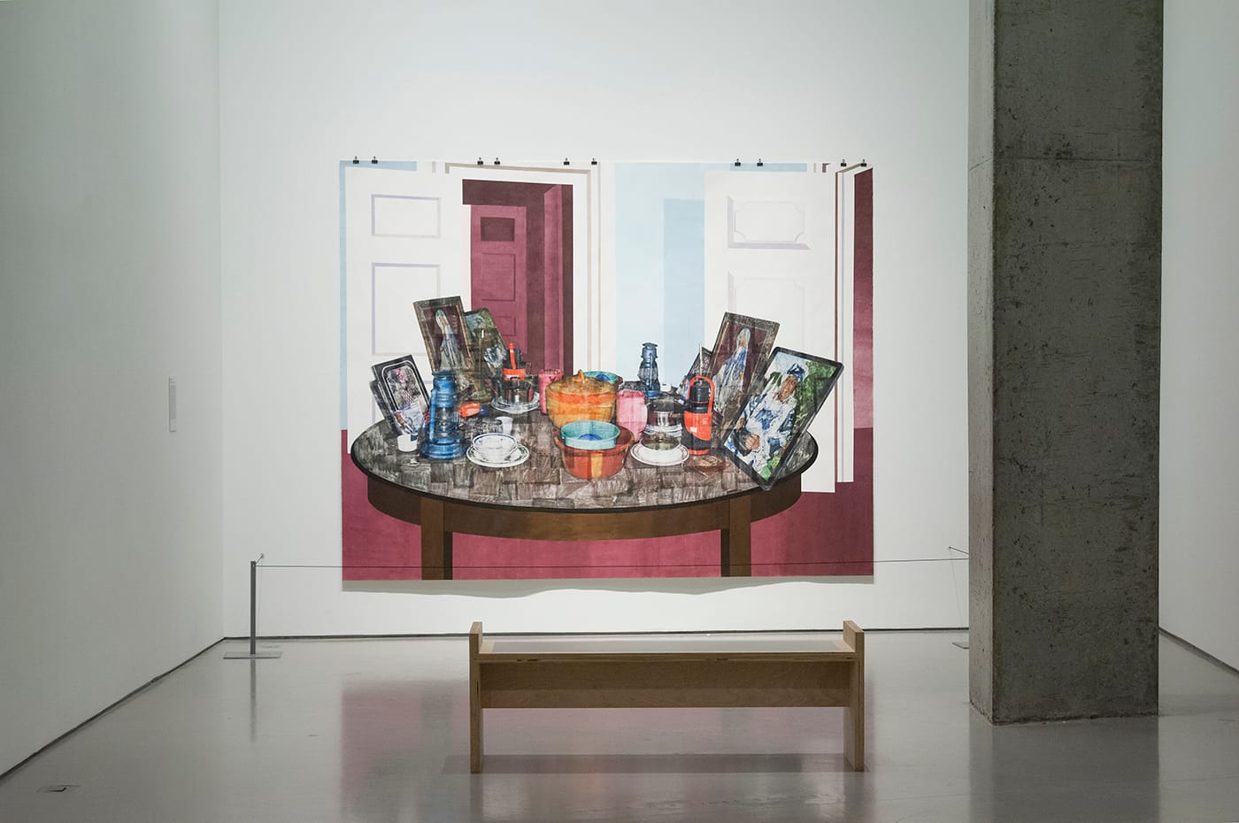 Sometimes these fields of painting and photography divide cleanly between foreground and background, as with “The Twain Shall Meet” (2015), which is the destination point at the furthest reach of the gallery, and serves as a kind of visual thesis for Predecessors. In this piece, an altar assembled by the artist’s grandmother — comprised of pictures, icons, cookware, and lanterns, and photographed extensively by Crosby in her grandmother’s Nigerian home following her passing — is presented in a neo-Cubist split perspective. All the objects on the table are rendered by layering bright photo paper, while the background is a formal arrangement of doors, walls, and floor in a controlled, almost chalky palette.