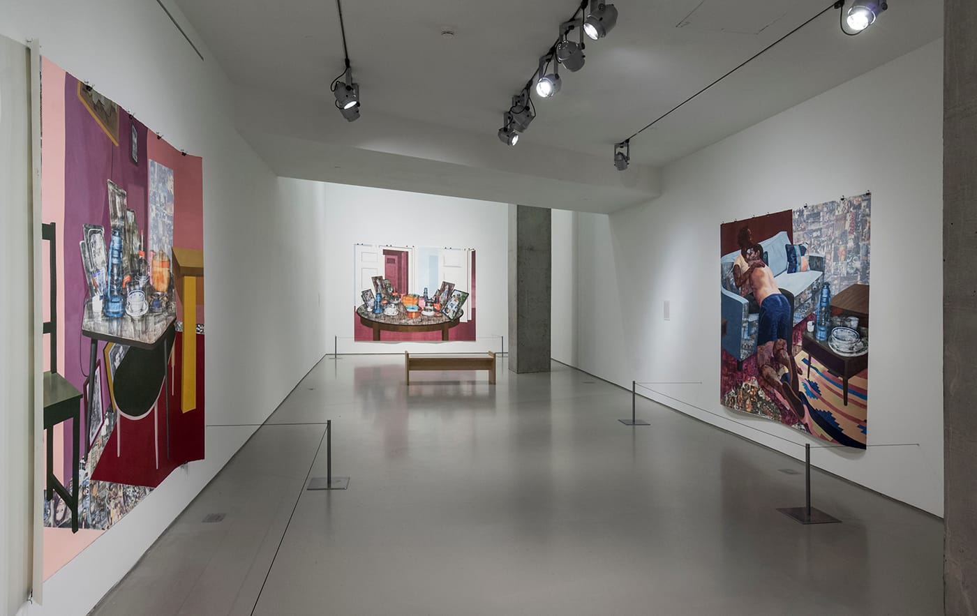 These works hang together in one of the CAC’s oddly angled galleries — a narrow space that evokes a chapel-like ambience, appropriate for the meditative viewing these works demand. Each presents an ostensibly simple subject — a jumble of objects on a tabletop, a seated female figure, a couple in an intimate embrace on a couch — but these surface images are composed of multitudinous layers. In each painting, you find smaller image fragments, including found media from Nigerian fashion magazines and tabloids, and original images of objects photographed by Crosby and image-transferred onto paper. Abstract shapes emerge out of these thin paper layers, creating patchwork zones that break up the rich colors.