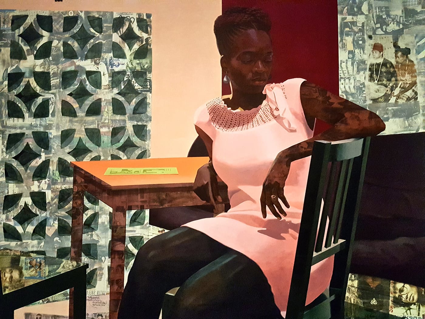 In other works, the mélange of media images bleed into the painted subjects, giving Crosby’s seated females — sometimes her sister, sometimes herself, sometimes an abstracted blend of the two (or more) — subtle full-sleeve tattoos, which upon closer inspection are images of Nigerian front-cover models. In some, the media whirl is relegated to the background, forming decorative panels, or literally filling the shadows with a kaleidoscope of imagery.
