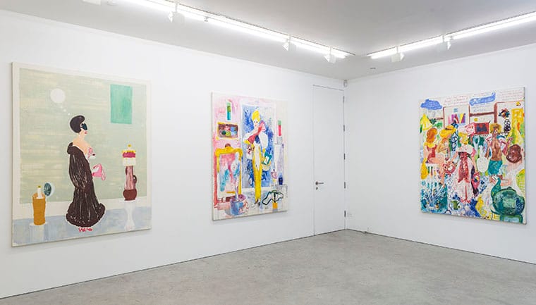 Thomas Trosch Paintings: New and Old at Fredericks & Freiser Gallery in Chelsea is exactly what its title promises. A few of Trosch’s older canvases in the back gallery survey his signature subjects and lush painting style. In these large, ambitious works, he paints the salons and boudoirs of society women; femme du monde outfitted and staged in idyllic movie-musical settings. With male companions in tow, Cole Porter lyrics and private conversations swim overhead. One envisions Peggy Guggenheim accessorized in artist-designed jewelry traipsing around her The Art of This Century gallery, or Iris Apfel adorned in oversized glasses and a bejeweled muumuu, or perhaps Midge, the sensible fashion illustrator from Alfred Hitchcock’s Vertigo. Time periods, from the 1920s to the ’70s, mix and mingle in a collision of froufrou interior decoration, costumes, and objets d’art.