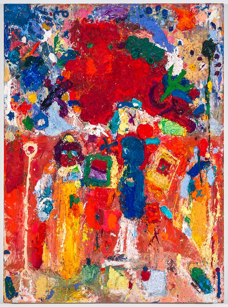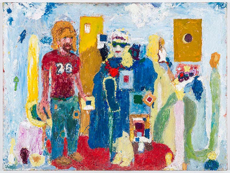 Trosch’s new work zeros in on the relationship between artist and model, patron and protégé, or kept boy and cougar. In varying scenarios, she may be painting him or he painting her, she receives an art lesson or discovers the young prodigy. She dons a party dress while he is often bare chested, wears a shaggy beard, and sports cutoff shorts and a graphic tee like a surfer dude. Sometimes they both are frocked like hippies in Godspell drag. The recent work is smaller, rawer, without words, and relishes in a primordial awe of paint. Most canvases are heavily impastoed and figures are rendered in crude primary colors resembling any number of the COBRA Group. Often the canvas is exposed, paint marks floating on the surface with smudges straddling the edges. There is a louche, meandering way Trosch fills in spaces with a naive unfussiness, dragging and sweeping the paint into rainbow blends or using pencil or the end of his brush to scratch out a detail.