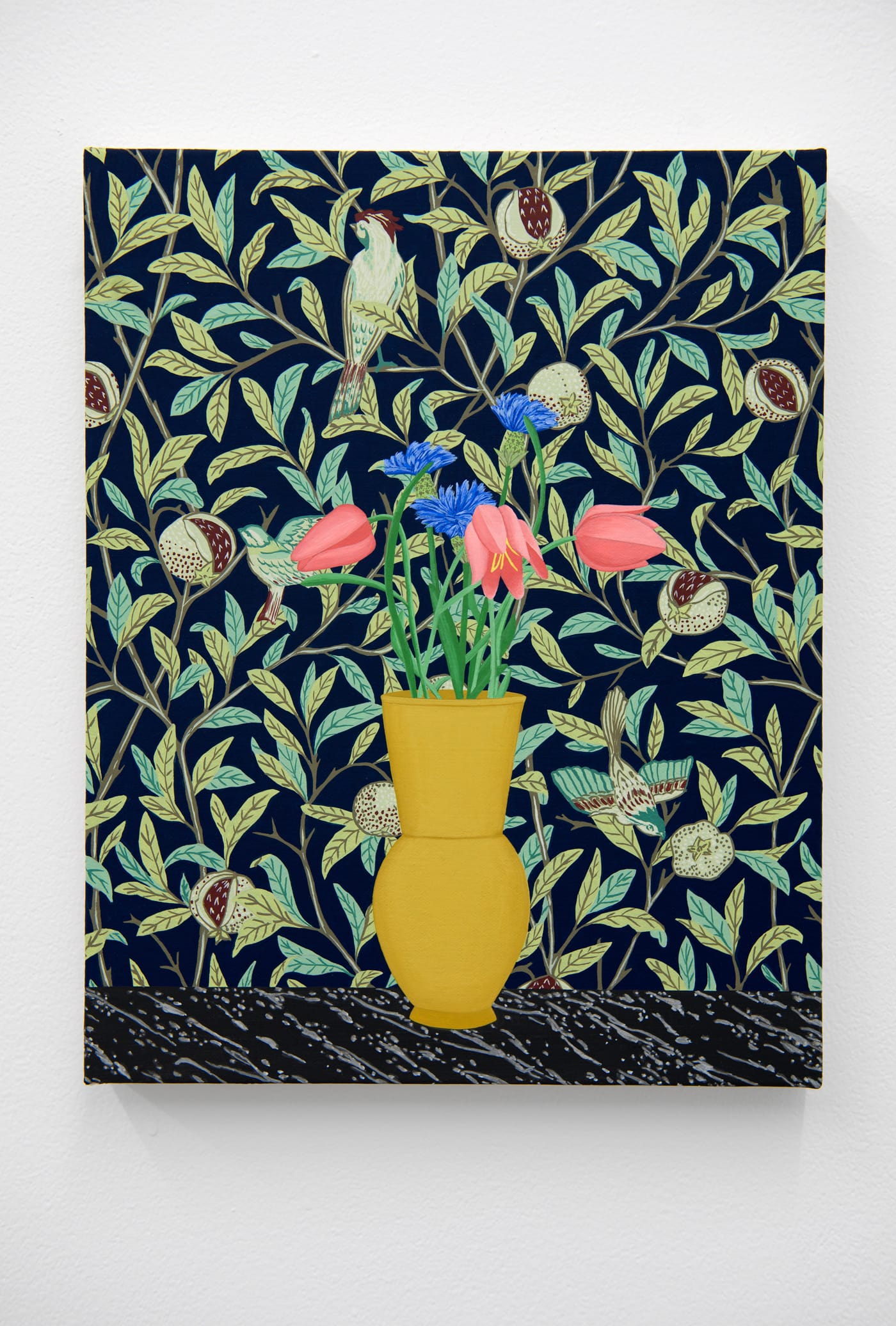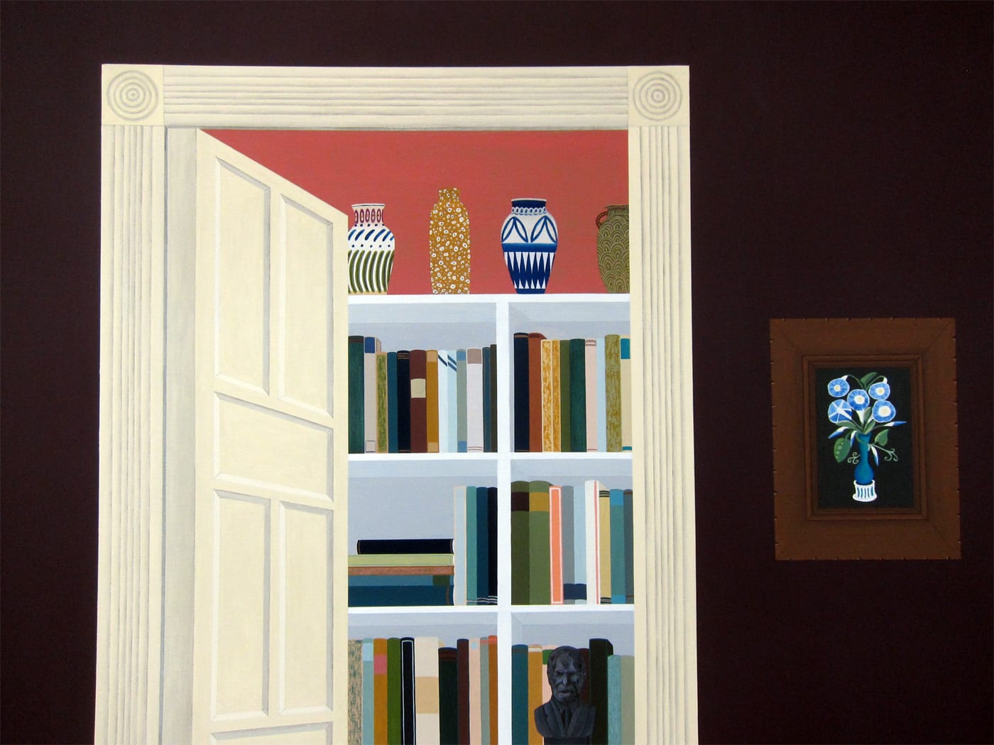 The show also features about a dozen small-scale paintings of book covers and decorative objects, such as vases and wall art, that appear in her larger paintings. These extend the fictional architectural spaces into the gallery so it, too, becomes her own constructed, personal space — one that we can actually walk around in — with these particular, chosen articles speaking to her own associations of home.