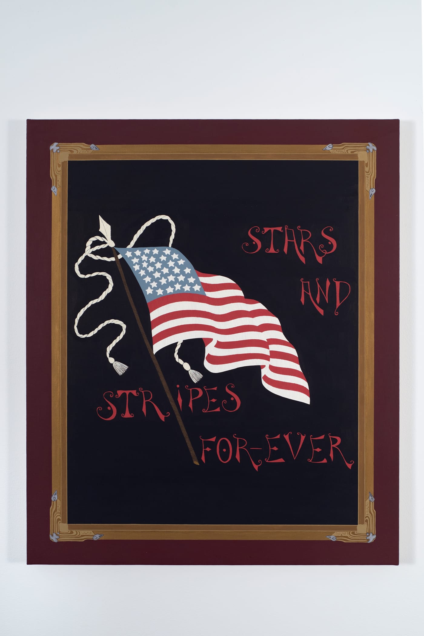 Two paintings of embroidery are especially personal: the original needlepoint of an American flag by her great-grandmother who was a suffragette; and one of the Irish phrase of allegiance, “Erin Go Bragh,” that hung in her grandmother’s house. Suss painted them partly because she wanted to honor her own family of women homemakers — a word, she told me, for which she has a slight disdain because of its traditionally gendered meaning. With Homemaker, she reclaims the term, devoting herself to the domestic space, but to domains that are utterly of her own and that are fully under her control. The title is also a proud assertion of her sustained labor and successful career as a working female artist. More broadly, it is a testament to her power and presence today in a system that has always catered more to men.