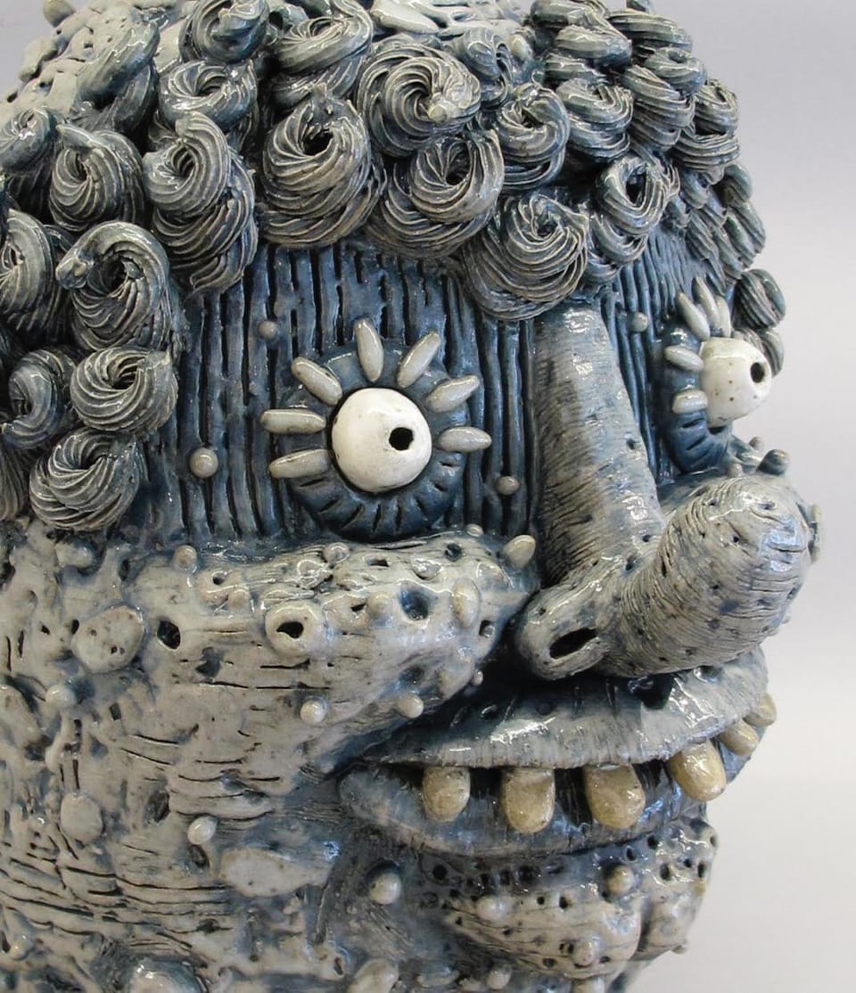 Morgan’s attention to detail and surface also manifests in her ceramics, which are inspired by face jugs. Face jugs in America have been traced back to African slaves working in pottery factories in Edgefield, South Carolina, in the decades before the start of the Civil War. Look at the surface of her face jugs — the grooved coils of hair, the pockmarks and pustules — and you’ll see how she has gone over every inch of the surface, both in the way she has worked it and in the color of the glazes.
