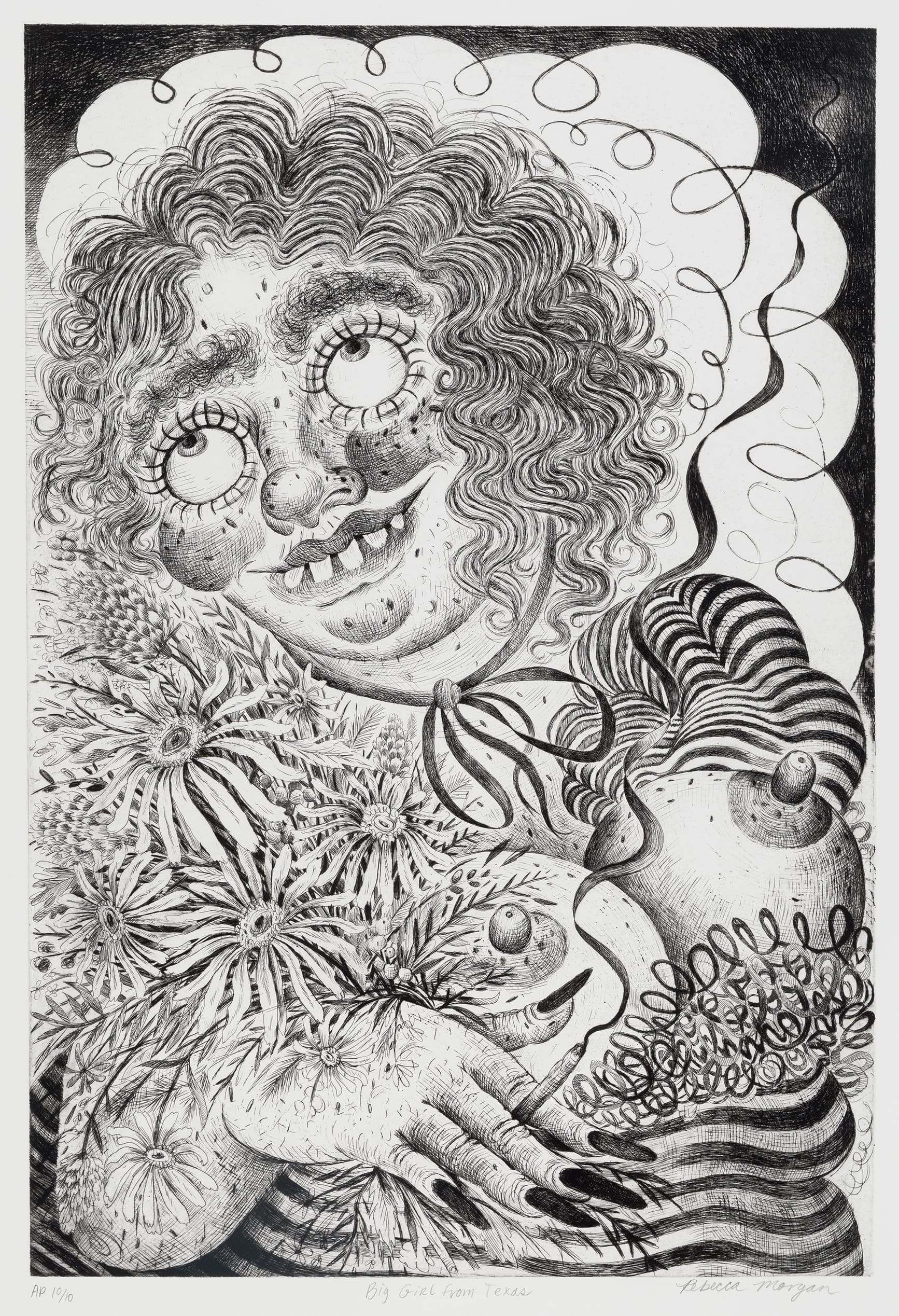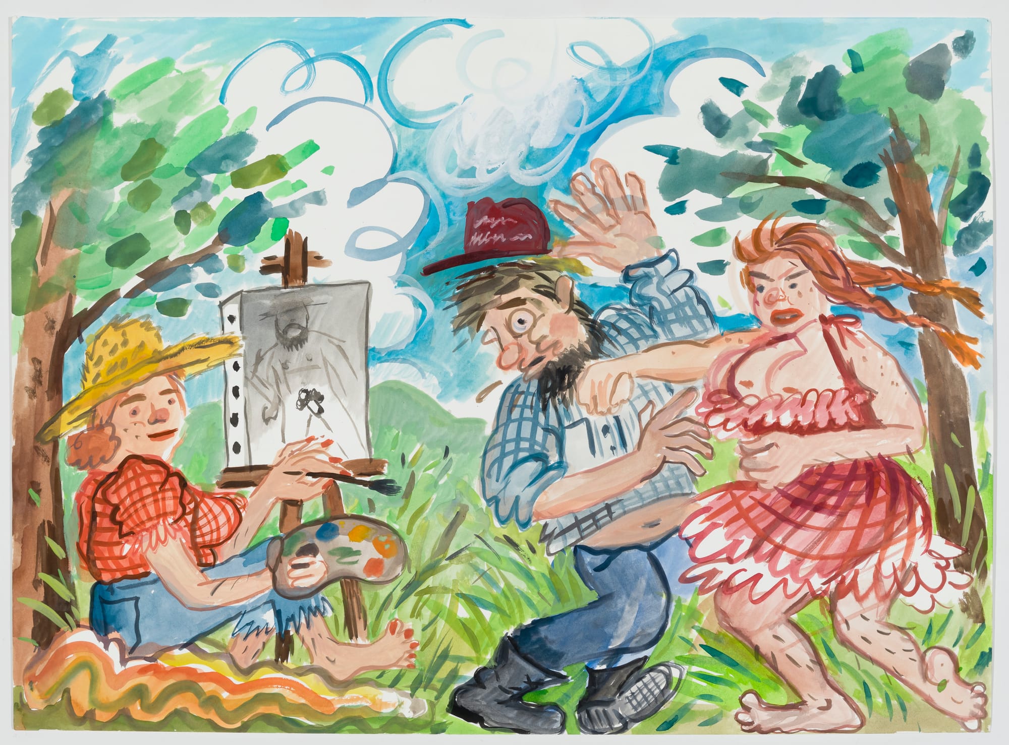 In the watercolor, “Self-Portrait Painting a Sluggin’” (2019), the artist depicts herself wearing a straw hat, plaid shirt, and jeans sitting at an easel. To her right, we see a young woman with her breasts peeking over the top of her dress punching a hapless man in the mouth. Morgan has mastered an illustrational style in this work, which she uses occasionally in this exhibition. This also got my attention because it became clear to me as I looked at her works in other mediums (particularly drawing and printmaking, the latter of which is new for her) Morgan has not packaged what she does into a style. While her influences may have included comic books, MAD magazine, which she told Oates her father had, and the cartoonist Robert Crumb, she works in a very different way in her prints and drawings than in her watercolors and paintings. And I have not even gotten to her ceramic and brass sculptures.
