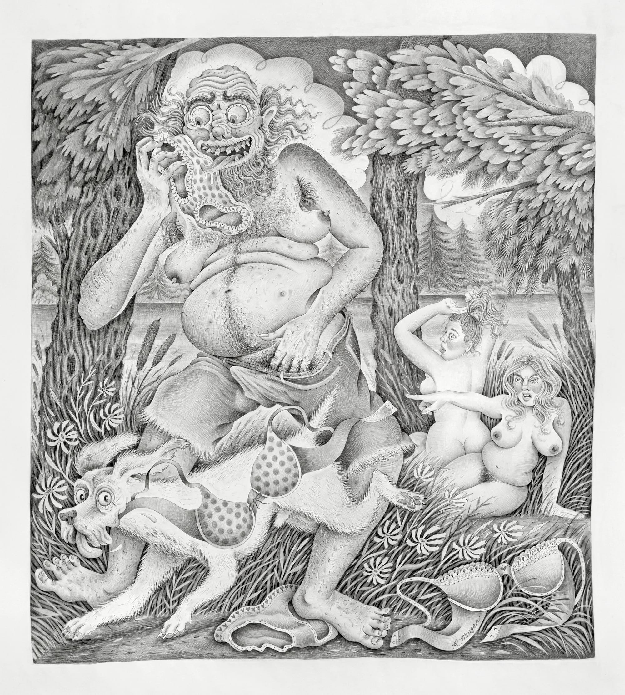 For one thing, the prints are more linear, and Morgan has paid a great amount of attention to articulating single strands of hair and the edges of shapes. This suggests that she allows herself to be guided by the medium. In the graphite drawing “Panty Stealers (After Diana and Actaeon)” (2019) — at a little more than 7 feet by 6 1 1/2 feet, by far the largest work in the show — Morgan’s tonal shading, distinguishing one form and surface from another, looks like it has not been reworked; tree bark, bulging belly, and hair sprouting from skin have all been carefully attended to with remarkable control. This control is also evident in her paintings “You Can Have It All” and Predator Swing” (both 2019).