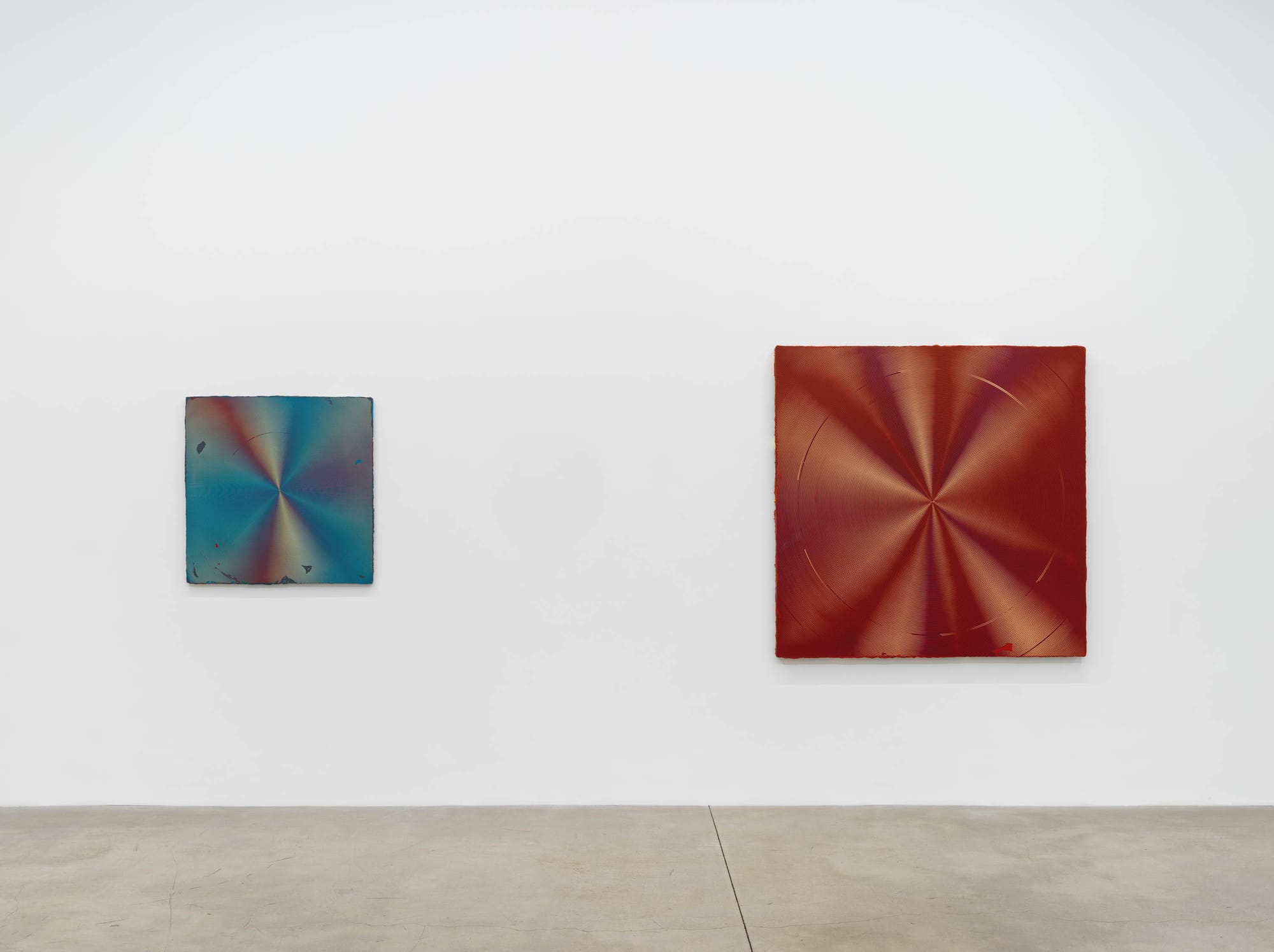 These dazzling data-rings are produced by pulling specialized, custom-made tools through wet acrylic paint. The binary of stripe/interval nets a mid-tone, allowing the artists to simulate the effect of blending or gradients without actually including any such paint handling; the precise admixture of hues striking the retina constantly changes as the viewer surveys the painted surface. Details of the procedure for applying color aren’t immediately clear looking at the works, though presumably the paint goes on in layers. The studio’s sandpaper budget must be considerable, as the surface of every painting is absolutely smooth.