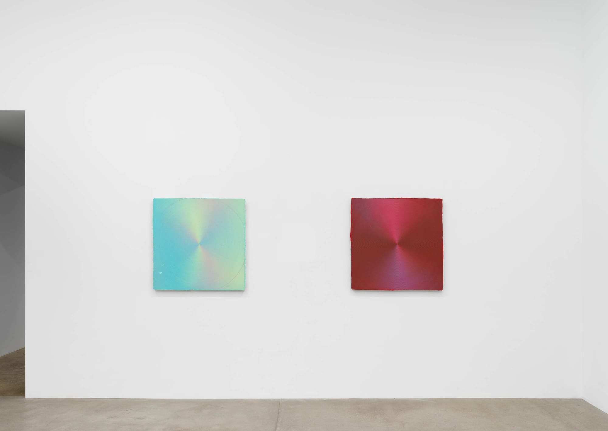 It’s not polished like glass; the paint surface itself is matte. From just a few paces away, however, it gives the astonishing illusion of sheen. Offset stripe-circles of stop-sign red and forest green — both mid-range in tonal value — dovetail nicely on the horizontal axis of “2019-P 29 (Circle).” Elsewhere in the painting they pull apart to reveal slivers of light greenish blue (arcing through the top half) and magenta-pink (bowling around the bottom section). The red completely eclipses the green along the painting’s vertical axis; there the lighter colors are as conspicuous as the red and together form the illusion of a puckered bulge. The difference in the colors’ value is sharpest at the painting’s core and fans out, softening at the corners. This lends the whole color environment a metallic shimmer, like that of colored foil.