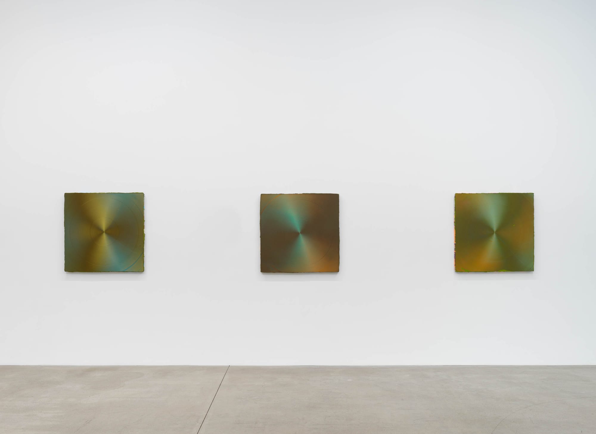 Straightforward in structure but visually confounding, the eight paintings in Relative Brightness, made collaboratively by Anoka Faruqee and David Driscoll, provide an understated retinal buzz with an undertow of genuine feeling. All dated 2019, the paintings are square in format — six measure 33 ¾ inches per side, the other two, 56 ¾ inches — and feature a primary motif of concentric circles, rendered as thin stripes about an eighth-inch wide, separated by intervals the same size. Each of a single, precisely mixed color, they orbit around a tiny dot of paint at or very near the center, extending outward to the edges and (by implication) beyond.
