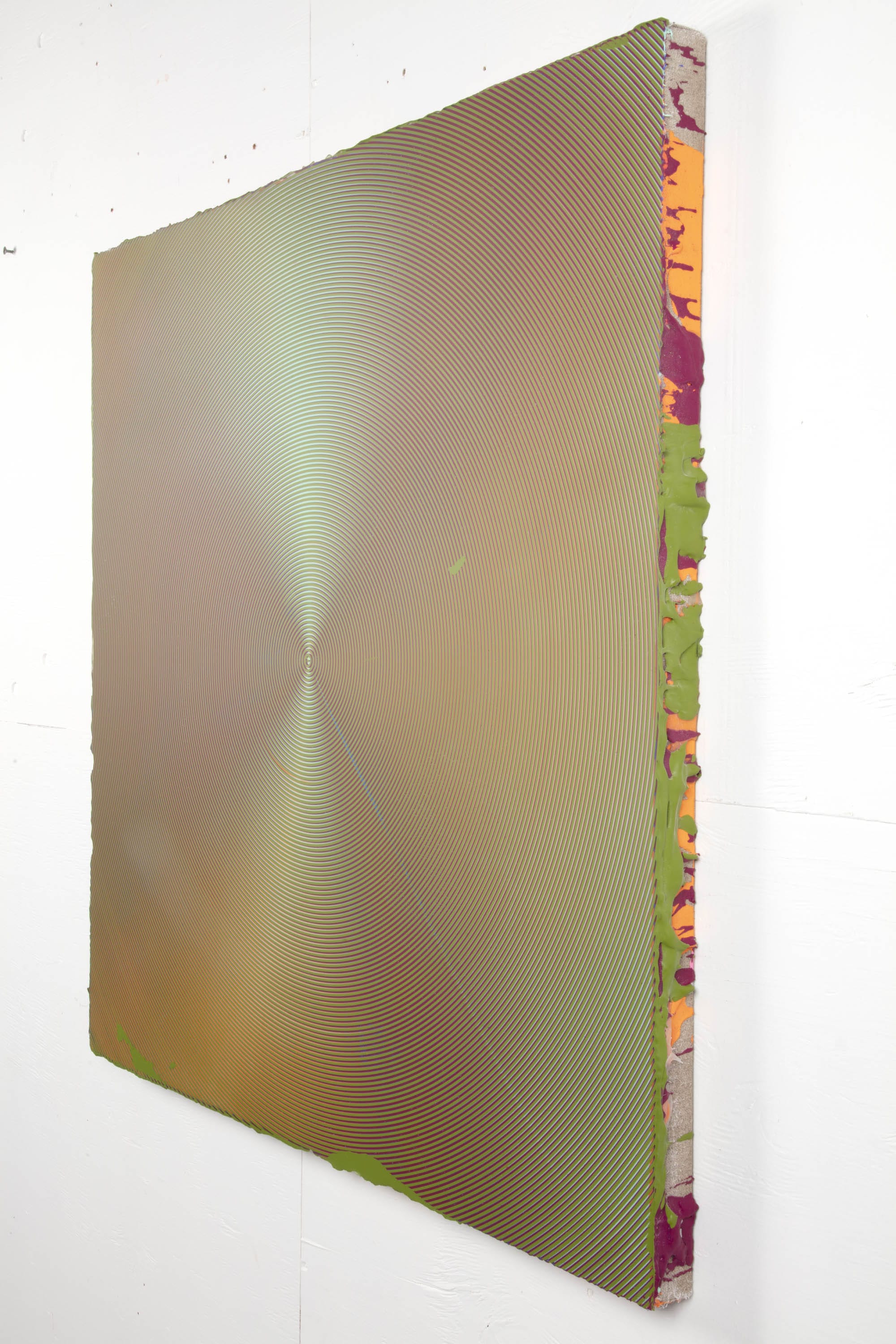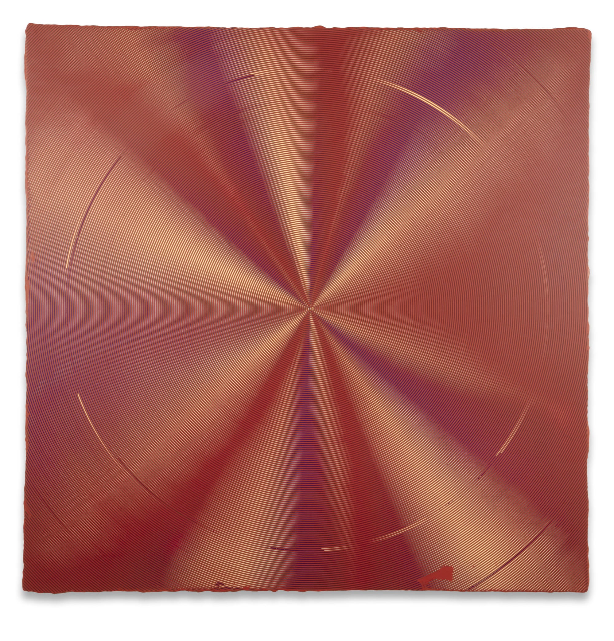 These dazzling data-rings are produced by pulling specialized, custom-made tools through wet acrylic paint. The binary of stripe/interval nets a mid-tone, allowing the artists to simulate the effect of blending or gradients without actually including any such paint handling; the precise admixture of hues striking the retina constantly changes as the viewer surveys the painted surface. Details of the procedure for applying color aren’t immediately clear looking at the works, though presumably the paint goes on in layers. The studio’s sandpaper budget must be considerable, as the surface of every painting is absolutely smooth.