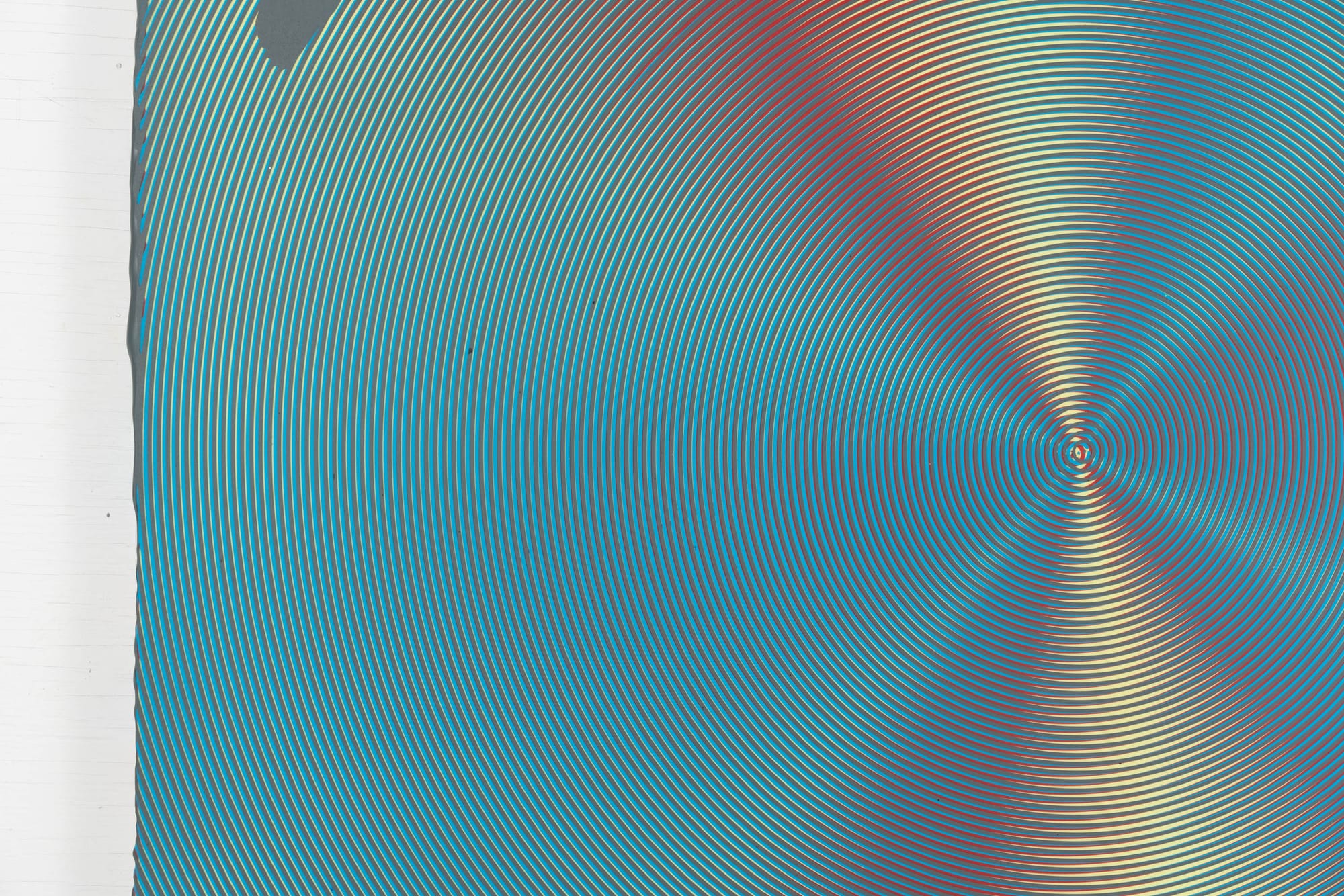By overlaying two or more such circular fields slightly out of alignment with each other, the artists put in play an interference pattern that transforms the surface of the canvas into a rippling, luminous field of ever-shifting optical sensations. Similar to a moiré effect, this perceptual condition emerges from the combination of discrete sets of visual data. (The reader should be aware that, on a computer screen, pixel-based display frequently introduces an additional, misleading layer of pattern to the image.)