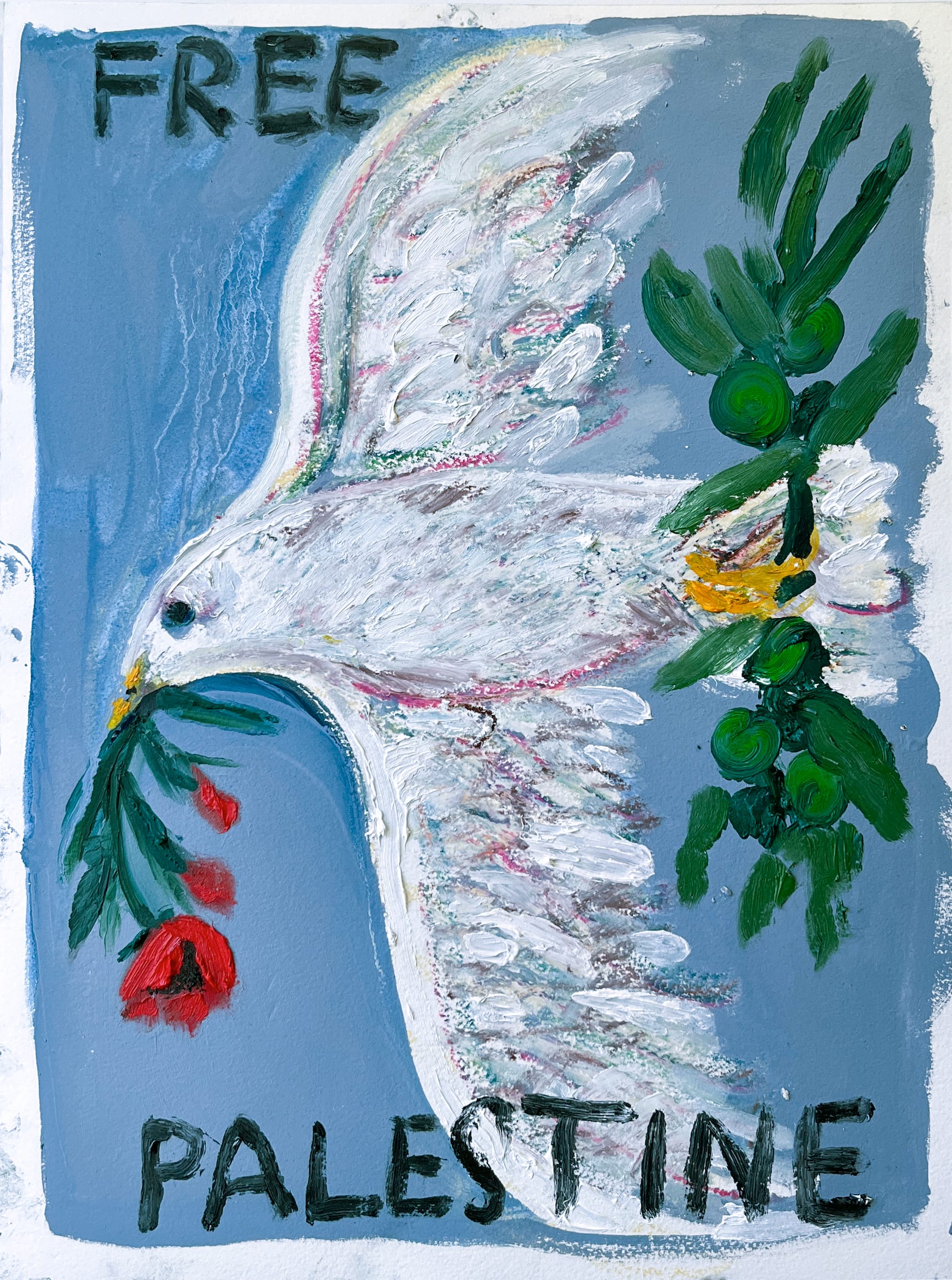 Olsen shared that there is a pigeon rearer near her place in Brooklyn, too. "On nice days at sunset he rallies his birds to fly in circles above our neighborhood with a large white flag," she told Hyperallergic. "After October 7, I kept thinking of that quote, watching these local birds soar, while also watching the barrage of unimaginable horrors coming out of Gaza. Like many artists I process through making, and so came the pigeons, and the necessary cues of resistance: Palestinian poppies, the olive branch."