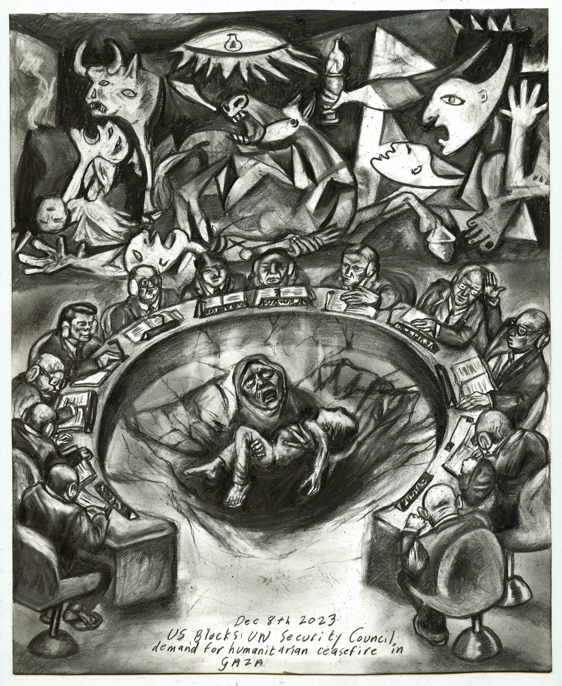 In "U.N. Ceasefire" (2023), Coe renders the United Nations Security Council's block of a demand for a humanitarian ceasefire in Gaza based on a single veto from the United States's representing party. A Palestinian mother holds the body of her murdered child in the center of the roundtable meeting, ignored by the group of 12 represented nations while Pablo Picasso's "Guernica" (1937) spans the background wall.