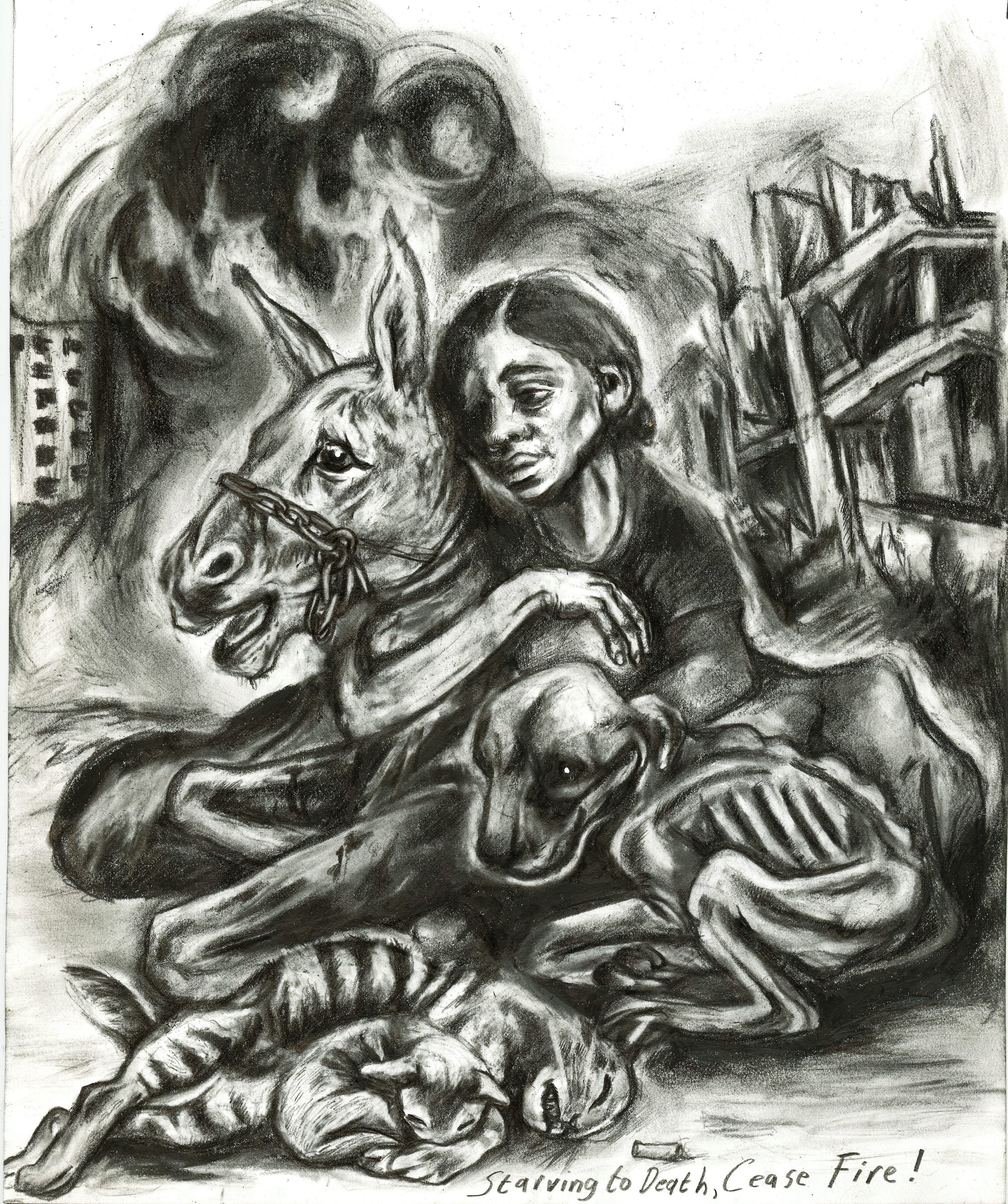 In "Starving to Death – Ceasefire!" (2023), Coe characteristically depicts humans and animals suffering alike as just skin and bones, commenting on the deadly impact of increasingly sparse basic resources for Gaza's civilians on top of the destruction of their homes and killings of loved ones.