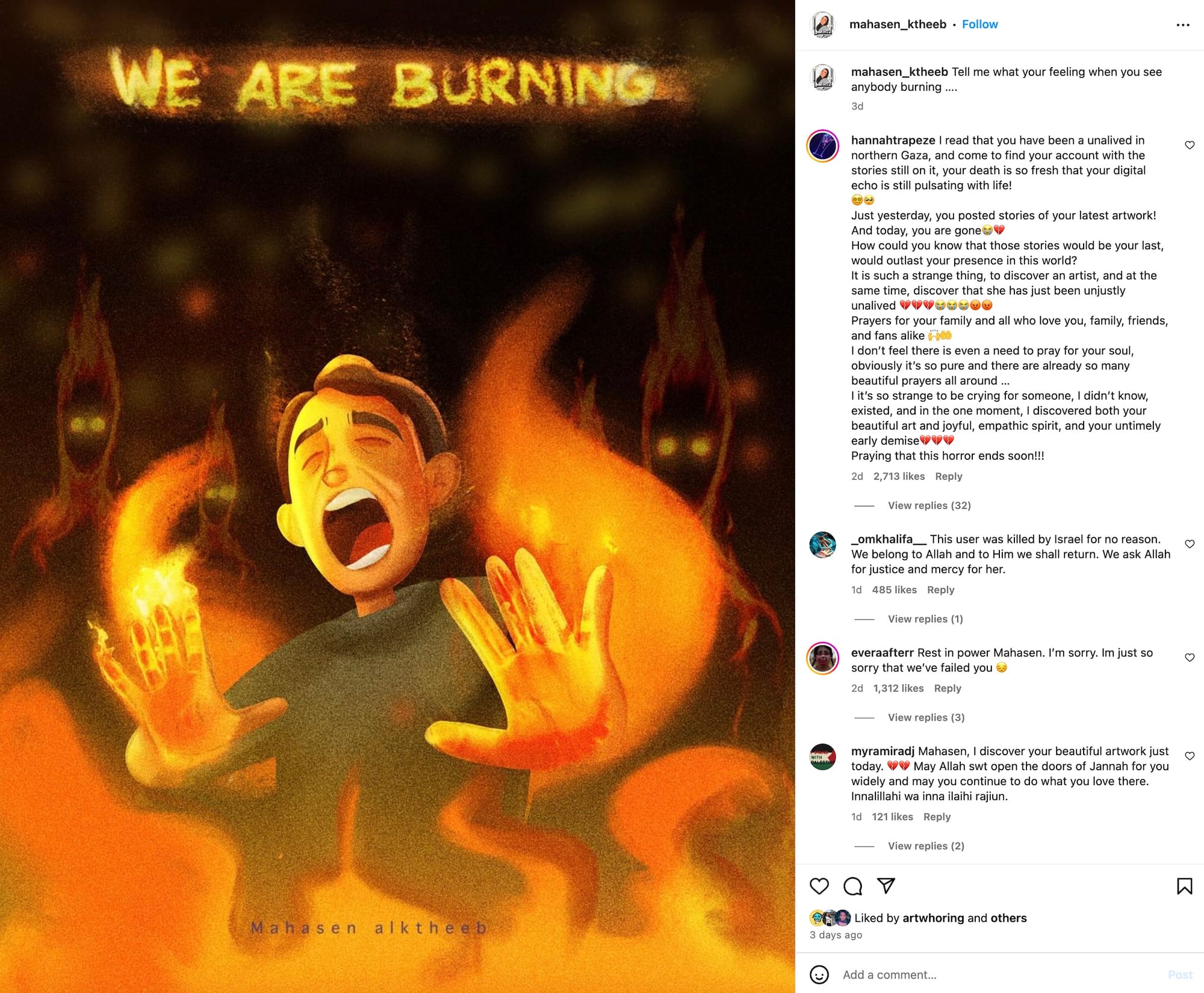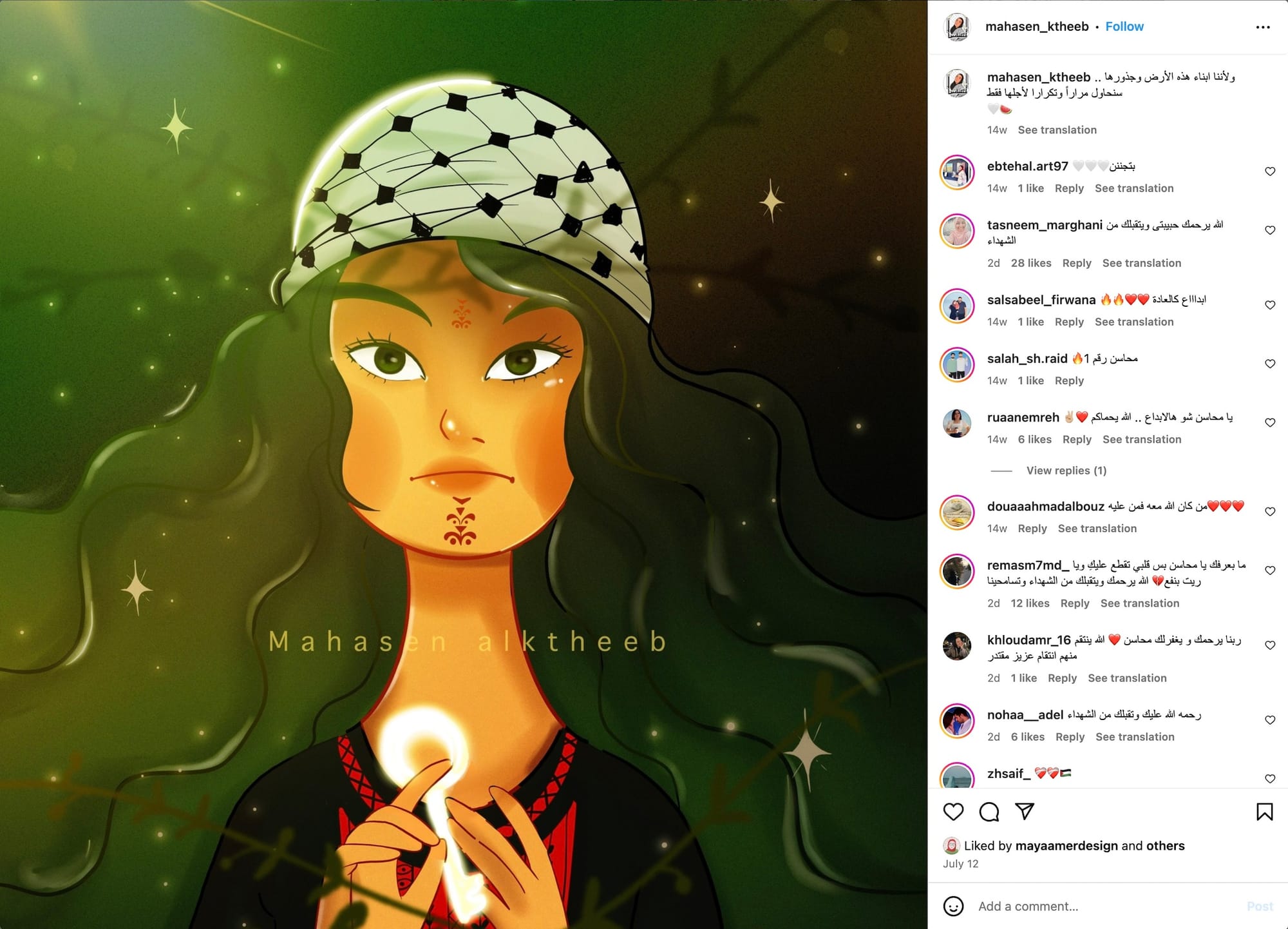 Al-Khatib's death was met with devastation and outrage as thousands of social media users continue to leave messages of mourning across Facebook, Instagram, and TikTok. In an Instagram post yesterday, the account Drawings from Gaza shared a tribute to the artist, who was featured on the page in March.