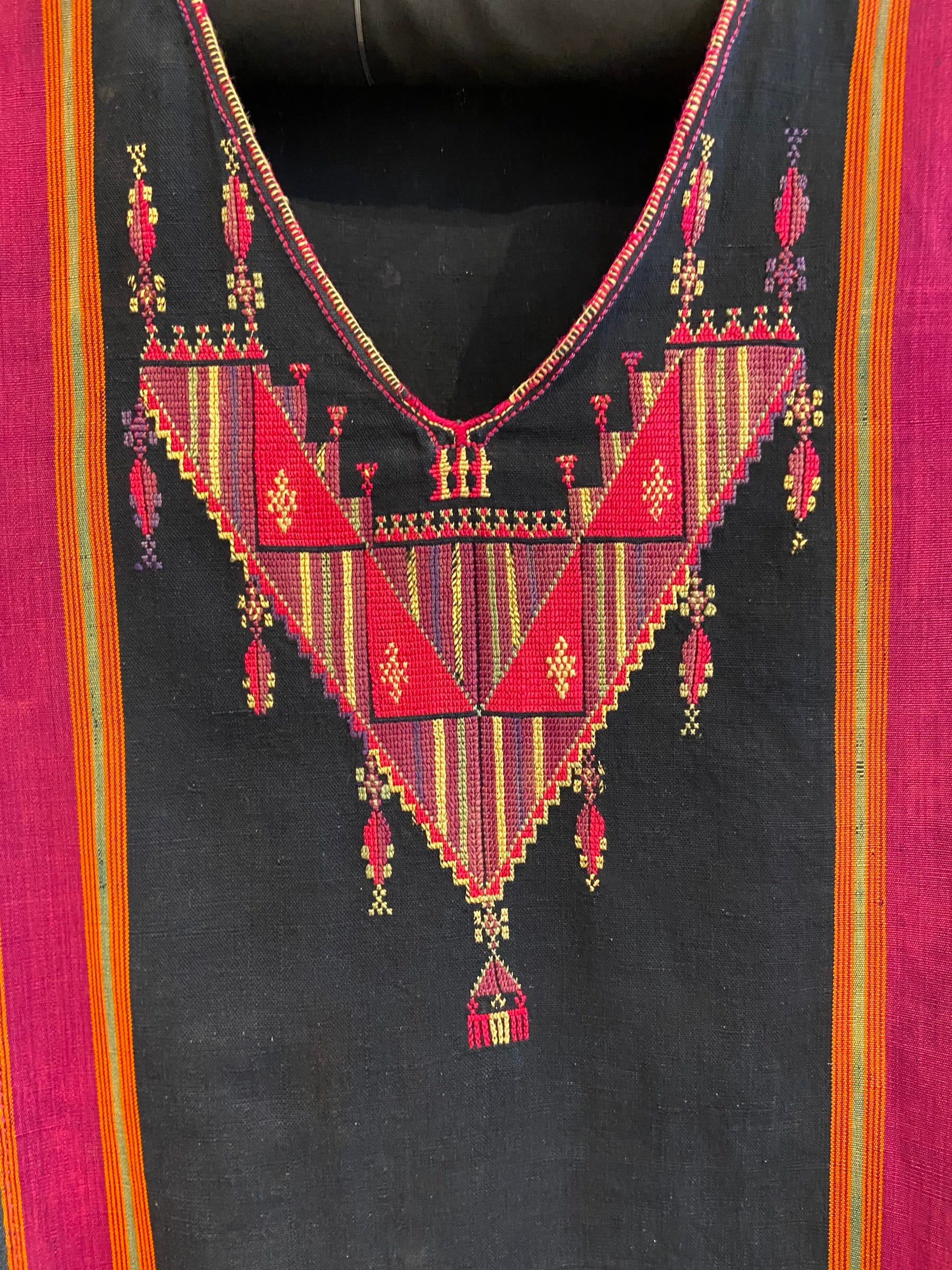 "The pattern I worked on is one from Gaza," Amer explained, adding that the chest panel "necklace" design was frequently featured on traditional Palestinian dresses (thobes) in lieu of jewelry. In addition to thobes, the embroidery was also frequently used on handkerchiefs, pillow covers, and other decorative objects.