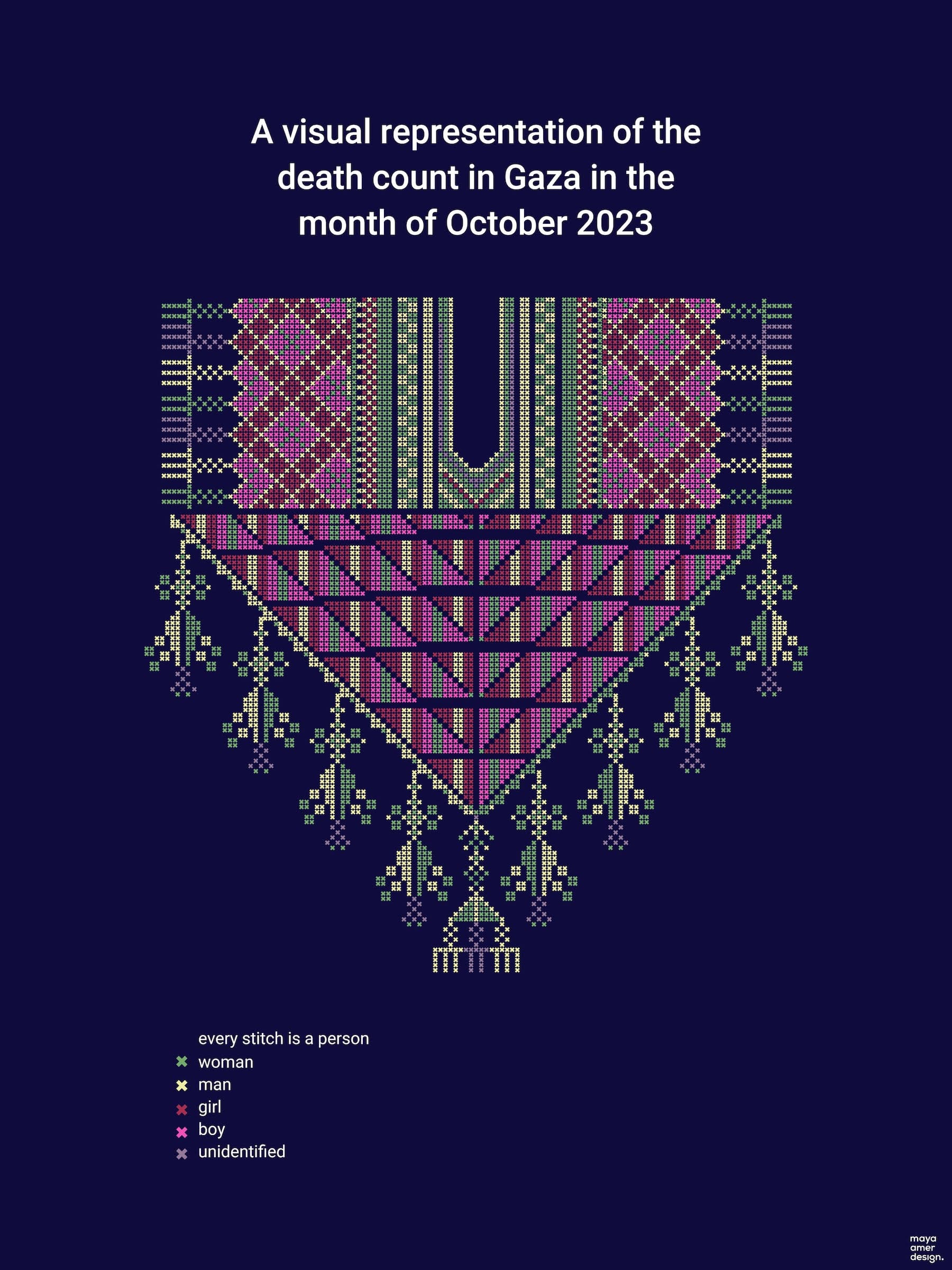 Maya Amer, a Palestinian motion graphics designer and illustrator, shared a moving animation on social media in which over 8,000 multicolored stitches represent children, adults, and unidentified people reportedly killed by Israeli forces in the Gaza Strip since the Hamas attacks on October 7.