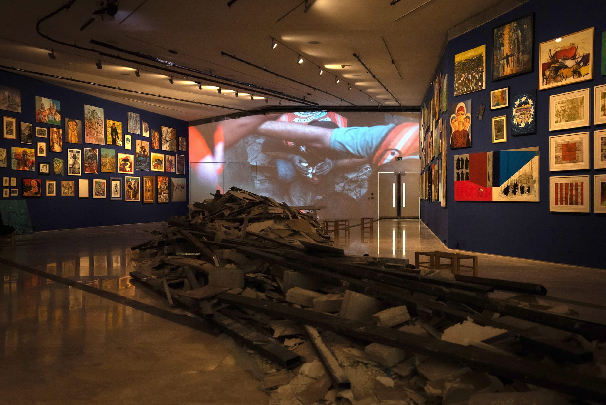 This is Not an Exhibition, featuring mixed-media work by Gazan artists from the 1970s to the present on loan from private Palestinian collectors and galleries, is conceived as a collective work. In a darkened gallery designed as a kind of shrine to Gaza, four 23-foot-high walls painted indigo and featuring a collage of paintings separated by a bridge of video works on both sides act as a single installation. The walls are embedded with social media messages about Gaza and the sound of Israeli drones plays in a continuous audio loop as a large screen video piece by Shareef Sarhan juxtaposes mediatized images of the war on Gaza.