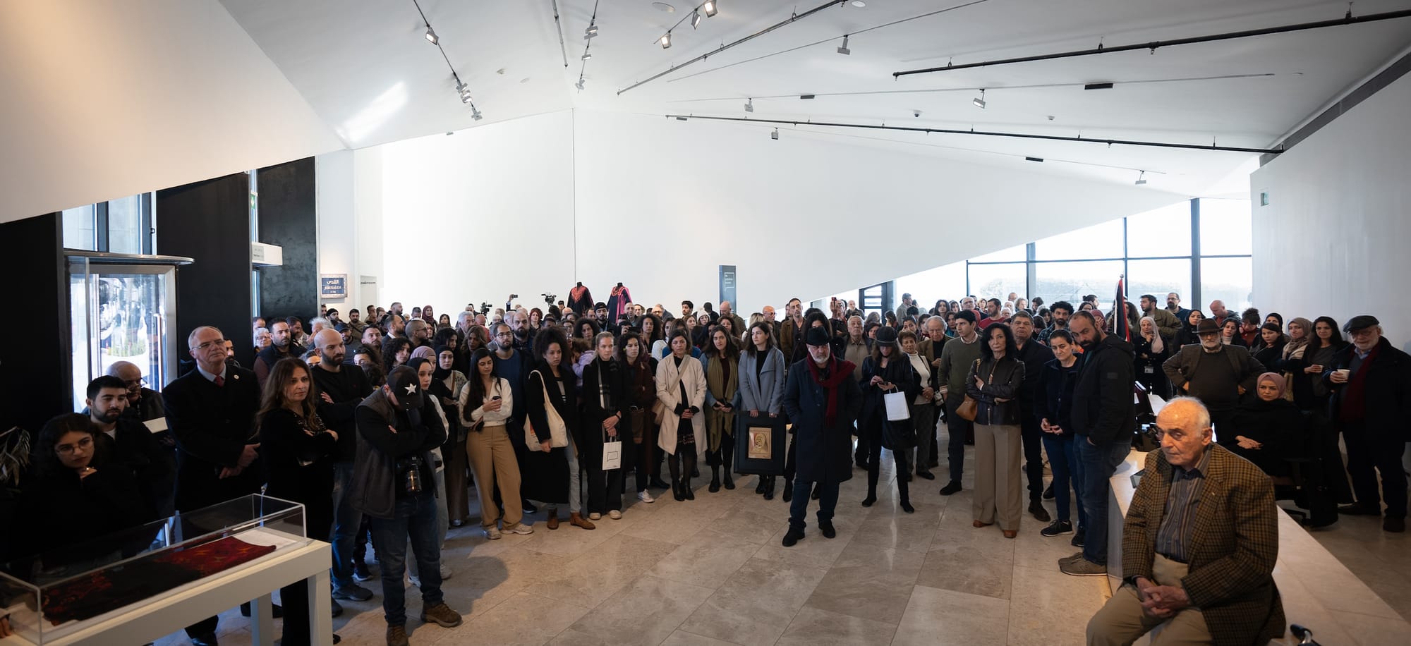 Three separate exhibitions that together “stand against the atrocities and systematic annihilation of Gaza,” according to a statement, opened to a crowd of 350 last Sunday, February 11. A WhatsApp audio from displaced artist Mohammed Al-Hawajri, recorded from his tent in Gaza and originally intended as a video but foiled by a weak internet connection, was displayed on a screen that greeted visitors. “We are still alive,” he said as he introduced the seven artists from his erstwhile Eltiqa Art Gallery, in the midst of background noise of the camp and the sound of Israeli drones.
