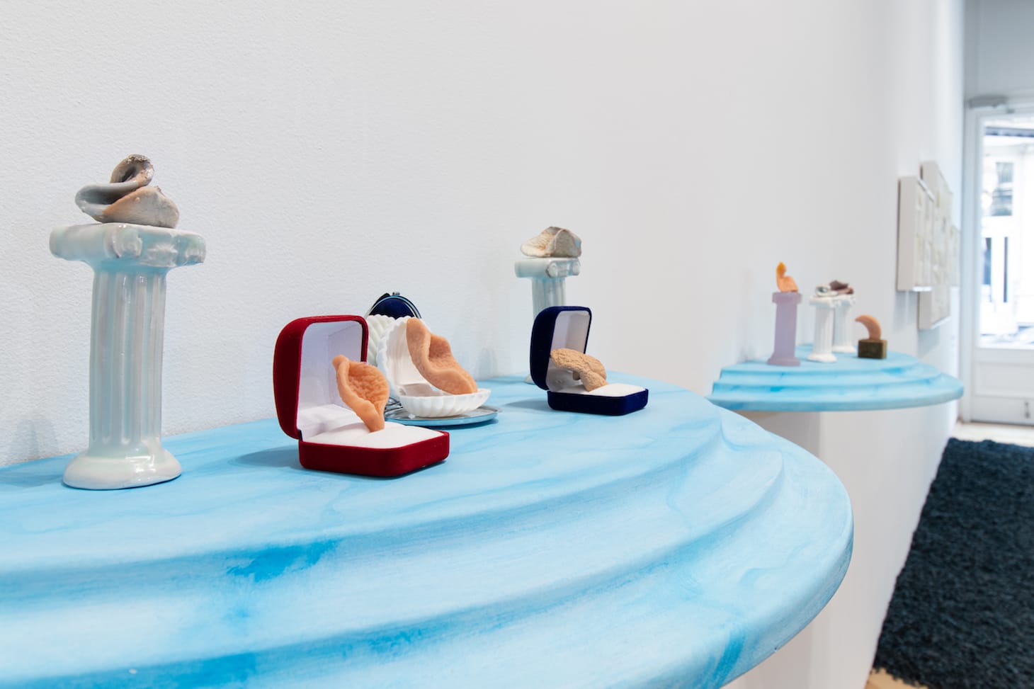 The highlights of the exhibition, in my opinion, are positioned on three wall-mounted pale blue shelfs that recall Venus’s half-shell in Boticelli’s “The Birth of Venus” (1485–86). Instead of the Roman goddess, the shelfs offer support to tiny Greek columns, velvet boxes, and open shells — all items that can serve as engagement ring displays. In place of rings, however, the displays are adorned with ambiguously shaped objects made of Sculpey polymer clay, and strangely reminiscent of uni — the sea urchin’s sex organ that produces roe. As Council mentions on their website, this Ringholders (2016–ongoing) series arose from their father’s continuous questioning of when Council would get married, despite knowing perfectly well that the artist is “not about that life.”