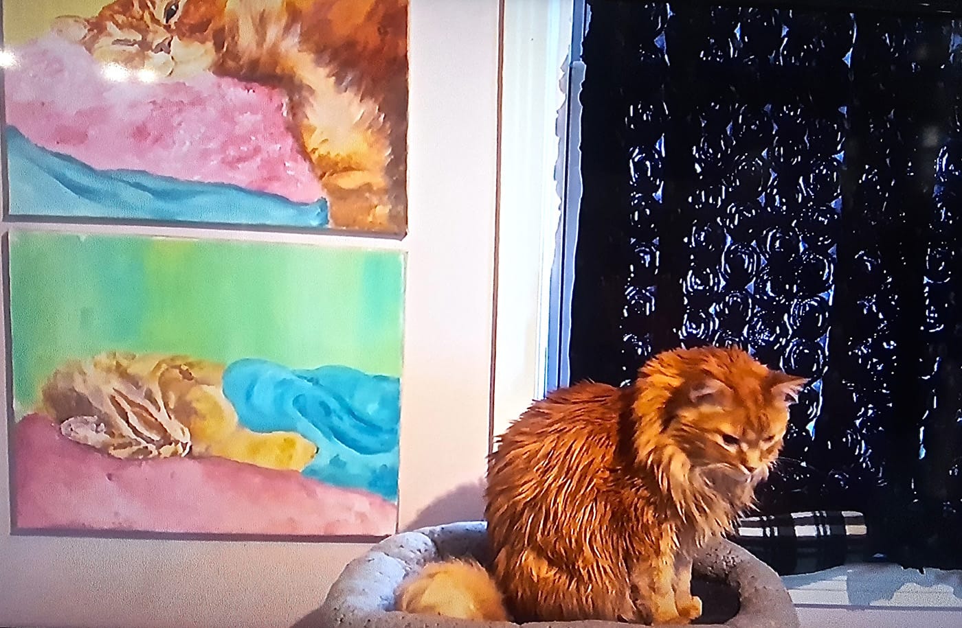This is only one of several really funny pieces in Parent Project, another being Angie Davis’s videotaped execution of CCS’s departing Chair of Fine Arts Timothy van Laar’s instruction: “Read a poem to your cat — ‘Fog’ by Carl Sandberg.” Davis’s cat, which is visibly commemorated in a couple of portraits that hang behind it in the video, appears largely unmoved by the poem. I arrived at the gallery just in time to be accosted by a team of card-carrying and inept ‘graffiti abatement professionals’ — played by Gallagher, his fellow student Jon Phillips, and ‘parent’ Ryan Standfest — as they prepared to abate the mural on the outside of Holding House. The phrase ‘master abator’ was bandied about quite a bit.