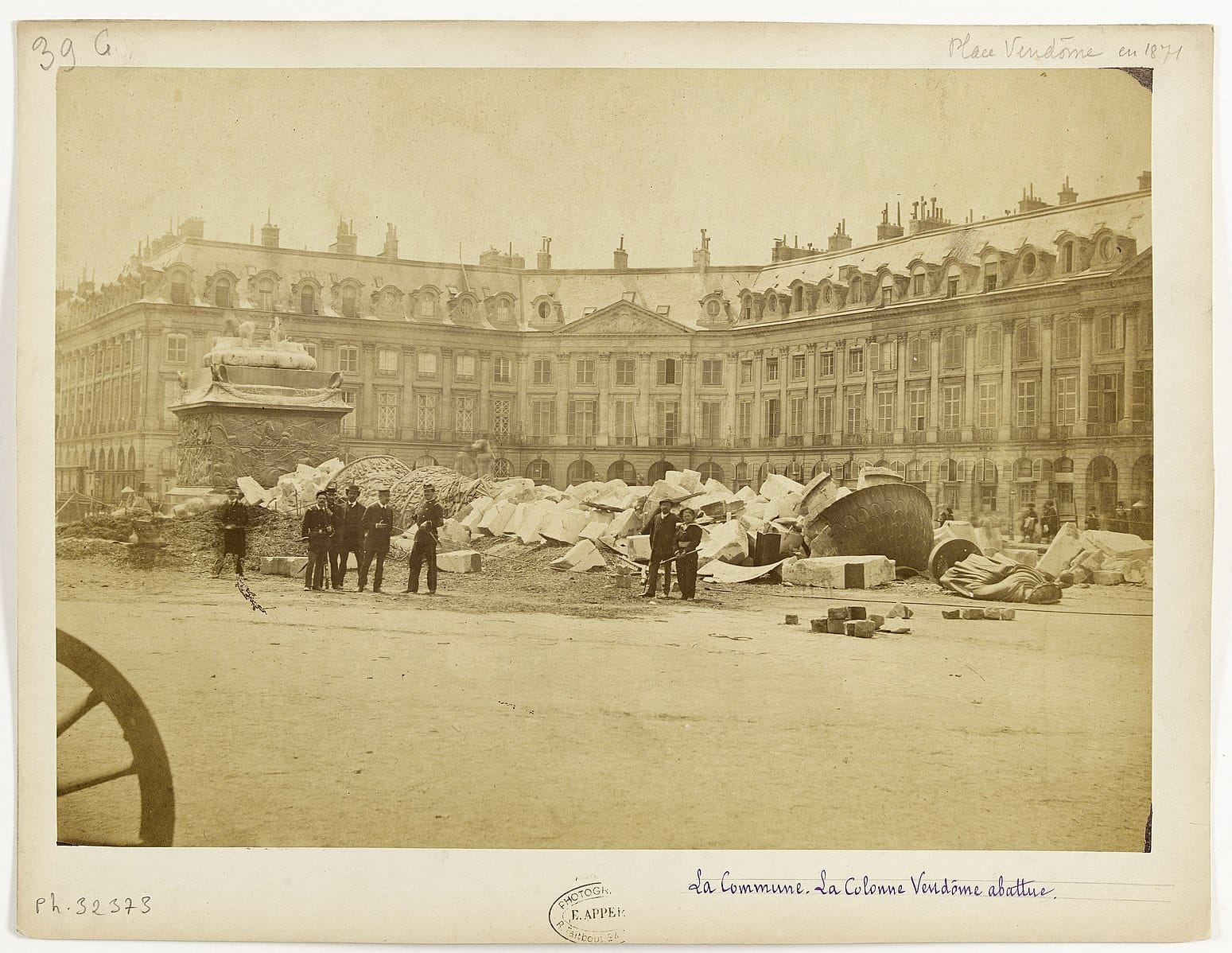 A photograph by Ernest Charles Appert shows Communards standing in front of the downed Colonne Vendôme, a monument to the First French Empire under Napoleon. This highly symbolic gesture accompanied the burning of the guillotine, marking a departure from the 18th century’s indiscriminate violence. The Commune transferred economic and military power away from wealthy elites and made positions of authority revocable for politicians, soldiers, and police officers alike. The flight of private property owners reduced violence and petty crime in the city, as Karl Marx described in The Civil War in France.