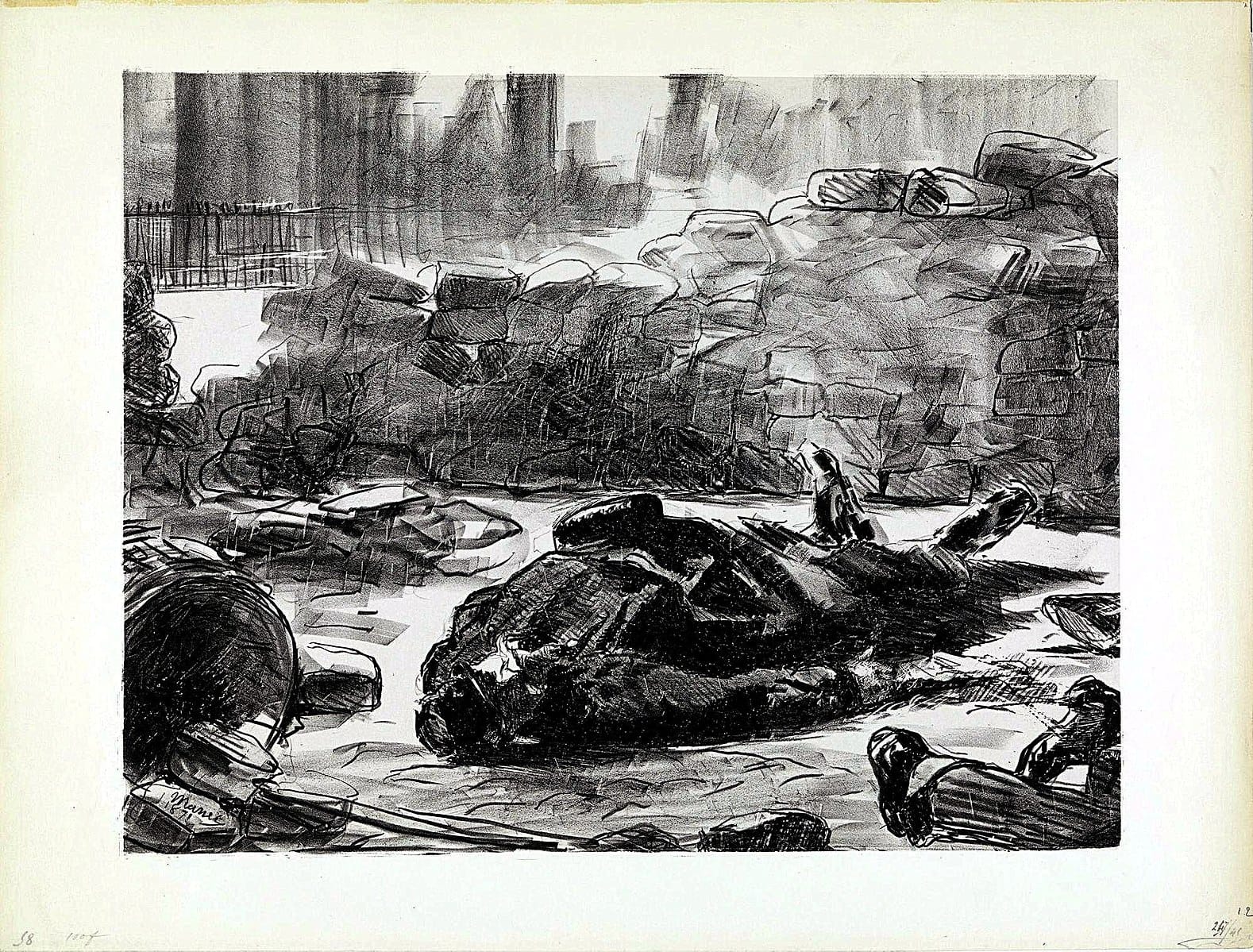 Anarchist artist Maximilien Luce painted massacred Communards in shades of deep blue. Édouard Manet, André Devambez, and Gustave Boulanger each created visceral battle scenes. Manet’s brother Gustave worked in the Ligue d’union républicaine des droits de Paris (the Republican League of the Rights of Paris), which attempted in vain to forge a peaceful resolution. Édouard, who also identified as a Republican, was not in Paris during March or April, but arrived in time to witness the Commune’s destruction and the corpses strewn about the city. Two of his lithographs from this time, The Barricade and Civil War, use sparse linework and shadowing to convey their gravity. While Manet was not a vocal supporter of the Commune, these drawings reveal his own conciliationism and sympathies with the victims.