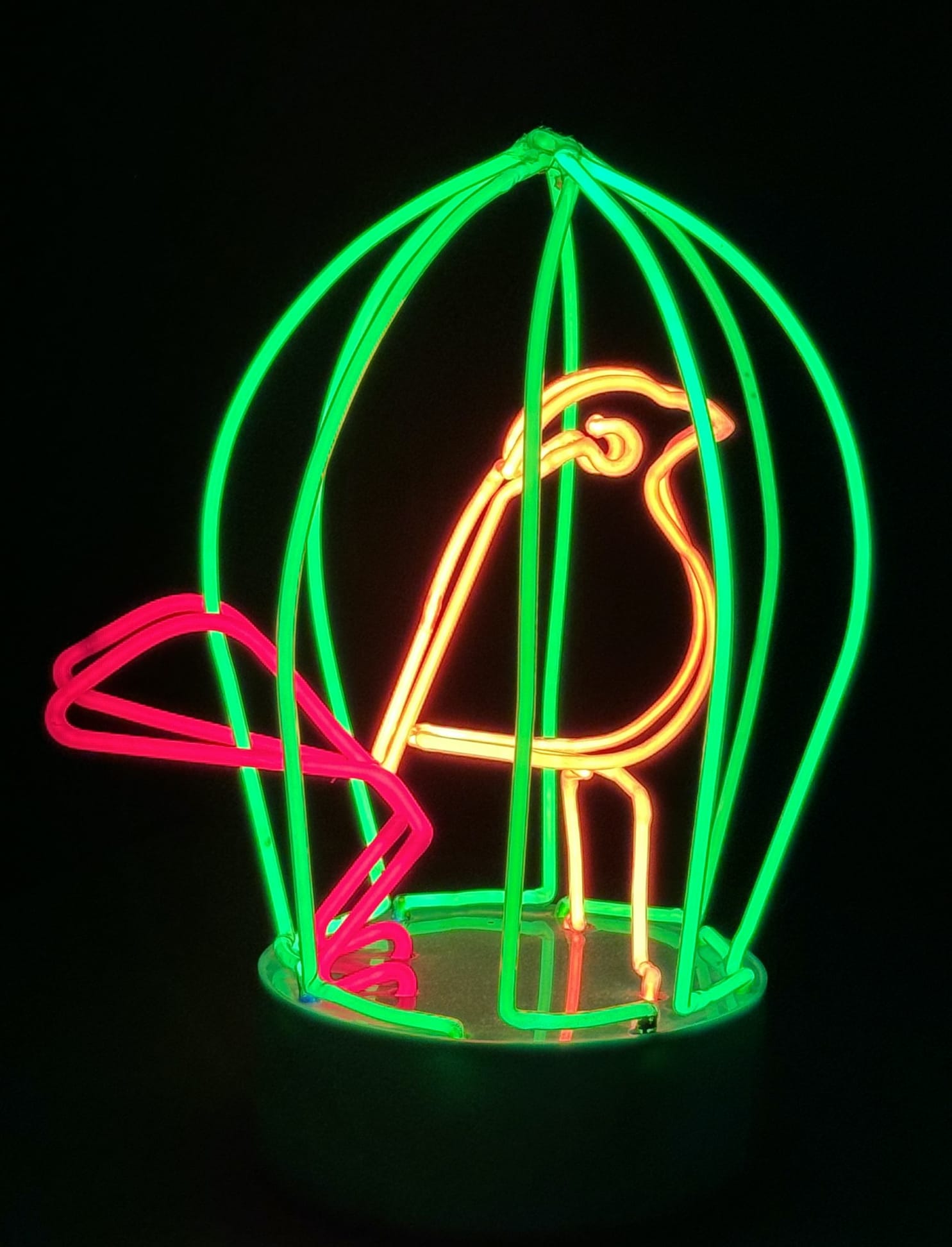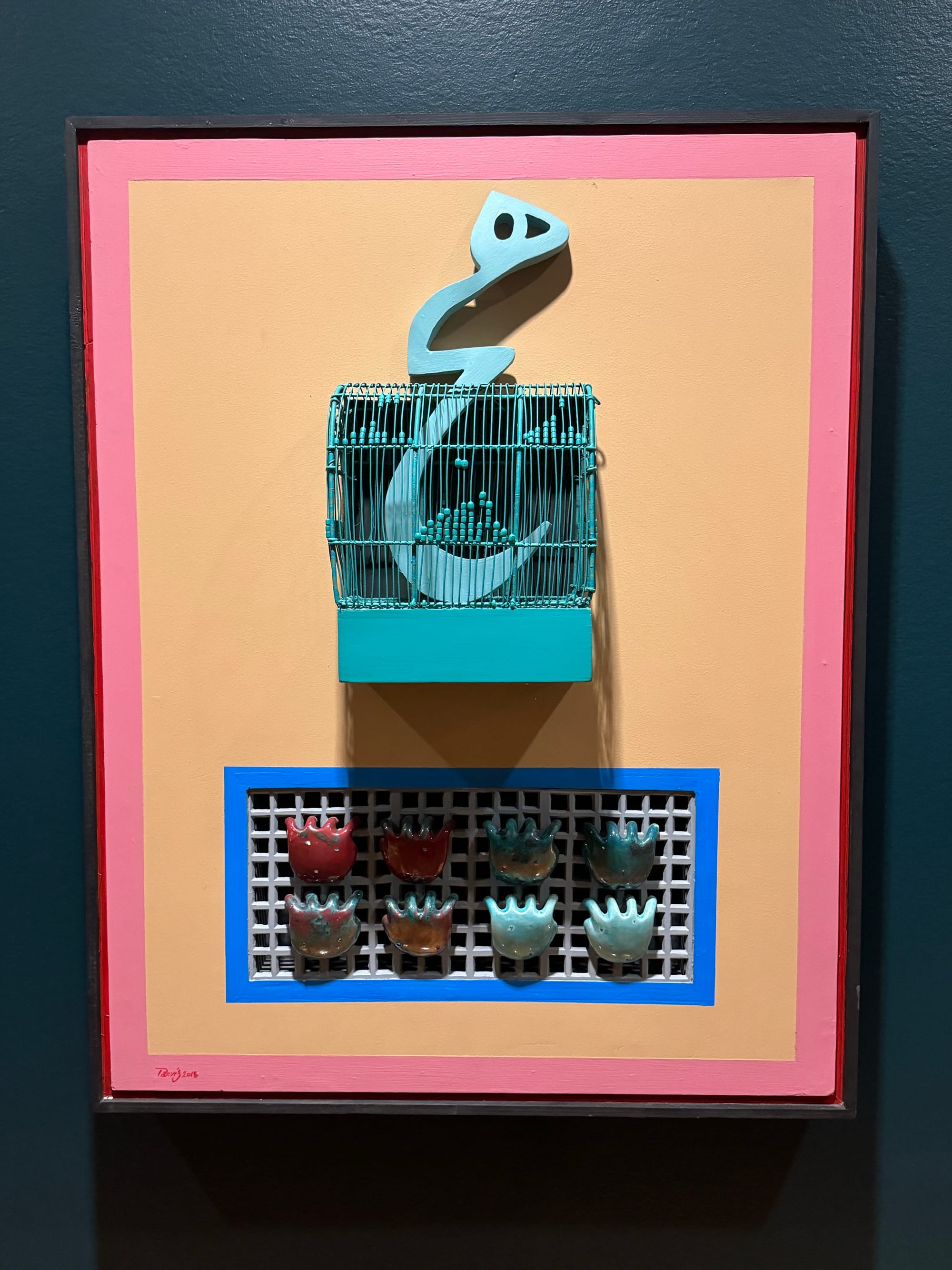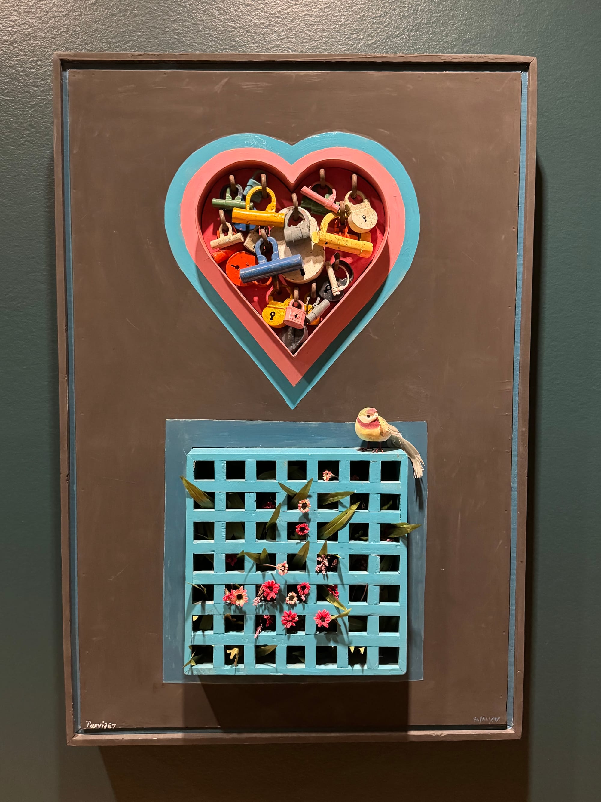 The cage also appears in more recent works, like “Happy Within” (2010); nearly a half-century after "Heech and Hands,” Tanavoli is still devoted to finding new and fresh ways to depict the cage that entraps the soul. And in numerous Sufi poems, the soul shackled within the body is likened to a caged bird, which he illustrates in glowing neon in "Bird and Cage" (2004). In other sculptures, Tanavoli plays with the lock's meaning in Sufism. For example, in "Locks and Cage" (1967), a sculpted pink heart encloses several locks above a cage with a bird.
