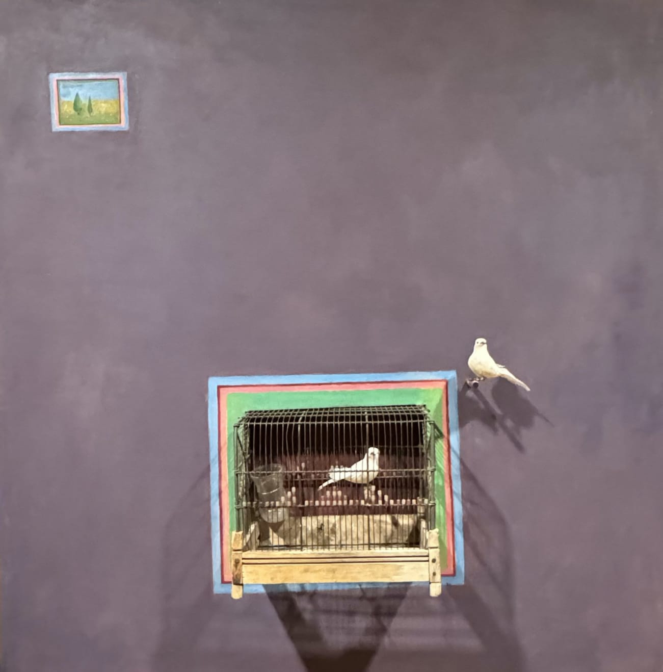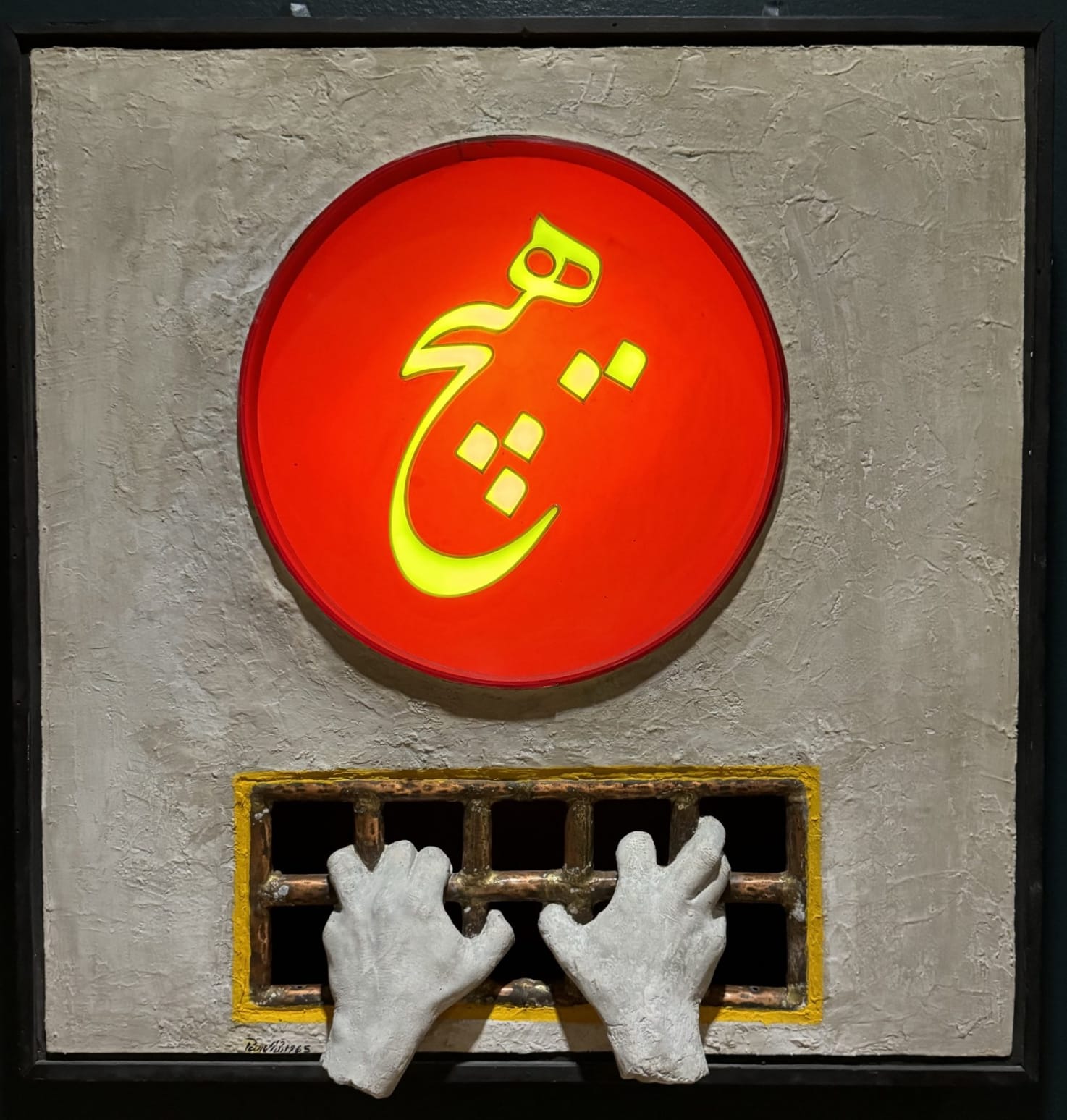In "Heech and Hands" (1965), the Farsi word for nothingness (“heech”) glows above a pair of hands clasping the bars of a cage. It alludes to the Sufi maxim, which is challenging to attribute to a specific author, “Sufism is to possess nothing, and to be possessed by nothing” — in other words, nothingness as freedom from the passions and appetites that leave us wanting more, and perpetually dissatisfied. In Sufism, these destructive desires are compared to a cage that traps the soul.