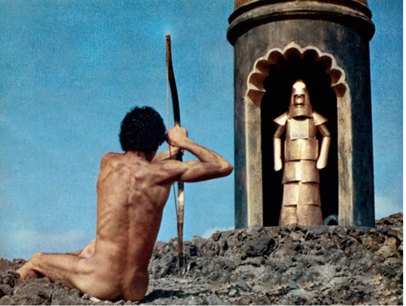 Movement is one of the key elements of the “Trilogy of Life,” series of adaptations of canonical works of literature he made in the early 1970s. Starting with The Decameron, based on the novel by Giovanni Boccaccio, and later with The Canterbury Tales and Arabian Nights, Pasolini looked back on the past to make films about the present. They are scattered films, embracing the narrative fluidity of the source material. But they are also attempts to make popular works, combining pre-modern texts with contemporary sexual mores. There is gay and straight sex, piss and shit, and shenanigans. The films are made to attract and offend, and contain a sense of bawdry fun that is generally not attributed to his work. The moral questioning of his earlier films turns into guttural humor. Pasolini appears in both The Decameron and The Canterbury Tales as characters but also as himself, winking at the viewer with trollish élan.