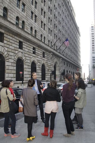 Sullivan also talked about the history of contemporary economics, abstracting your desire, living in a postironic state, going into debt, turning your desires into needs, and assuming formlessness, all the while visiting landmarks such as 55 Wall Street, the New York Stock Exchange, Federal Hall, the Federal Reserve Bank, and Cipriani, a luxury restaurant where Wall Street executives attract and sway new talent. But there was a lot of intended irony in the performance. He used his character to point out what these institutions are doing and how badly they are run. What would a seminar on becoming a successful banker look like if we based it on the real actions of people on Wall Street? The Fed has gone into massive amounts of debt, and we are somehow supposed to see this behavior as smart and correct?