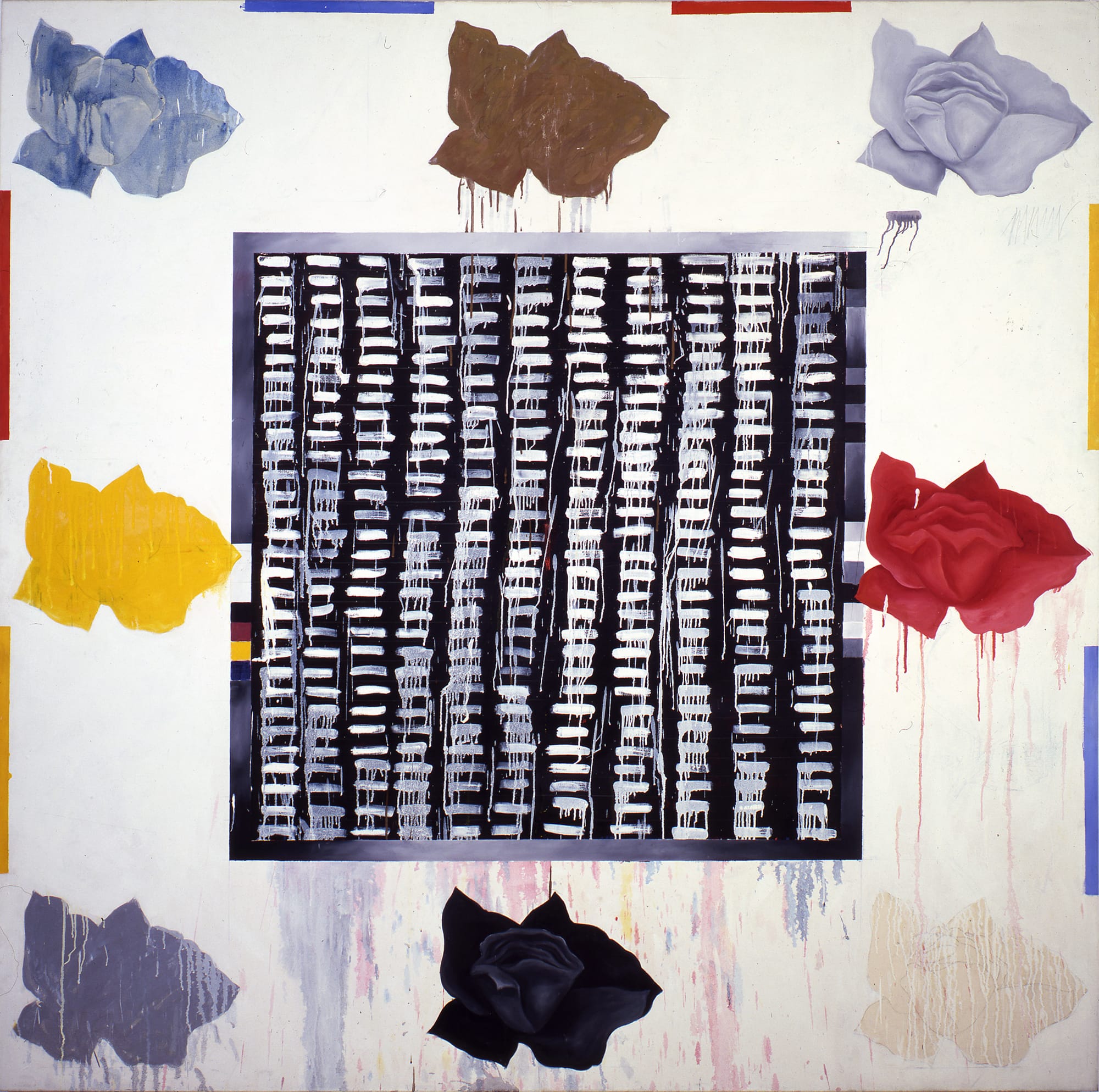 Steir’s conceptual- and Minimalism-adjacent painting practice did not literally depict the unfolding feminist and civil rights movements. But literalism is not necessary to grasp the philosophies undergirding her monochromatic, early-’70s canvases and wall drawings, some of which featured crossed-out roses — emptied-out symbols of aphorisms like Shakespeare’s “A rose by any other name would smell as sweet” and Gertrude Stein’s “A rose is a rose is a rose.”