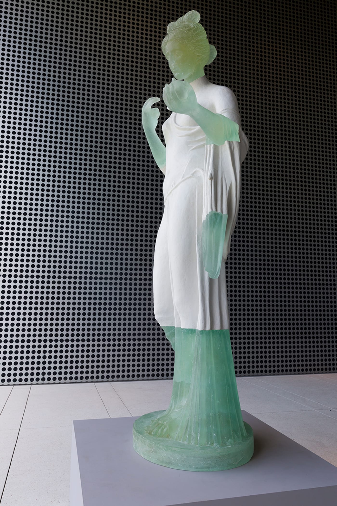 “Aphrodite Reimagined,” a towering 10-foot-tall statue gracing the museum’s outdoor balcony overlooking the Hillborough River, is the artist’s vision of the goddess, inspired by a fragment of a marble torso from 1 AD in the museum’s collection. Recreated on a larger-than-life scale in cold-cast marble, the torso now has a head, arms, and legs fashioned in resin the pale shade of aquamarine blue, like beach glass. Mimicking the drapery and posture of the original statue, Cronin’s version reads as both ancient and modern simultaneously, allowing contemporary viewers to gaze upward at the classical figure just as ancient audiences once did in columned-filled temples.