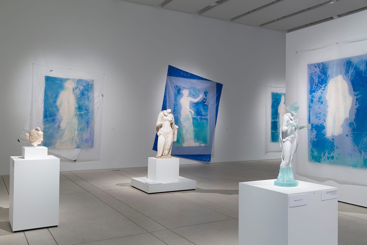 But Cronin’s own contributions are in the spotlight here, especially her series of paintings inspired by various renditions of Aphrodite found in museums around the world, such as “Aphrodite of Cyrene” from the baths of Diocletian and “Diane and Aphrodite” of the British Museum. These paintings in a monochromatic shade of blue are reminiscent of cyanotypes and just as ghostly. They came about when Cronin painted silhouettes of the statues on canvas, resting them on a sheet of plastic on the floor of her studio. Later discovering that the plastic was as beautiful as the painting, she transferred the image of the paint residue to sheer fabric which she then draped over her paintings, creating a multilayered artwork that feels almost interactive. The installation of these works surrounding the gallery is absolutely ravishing.