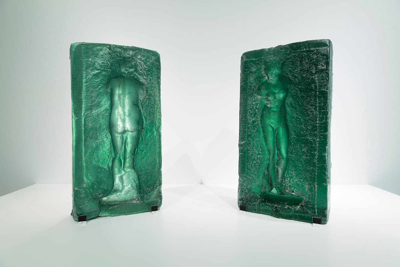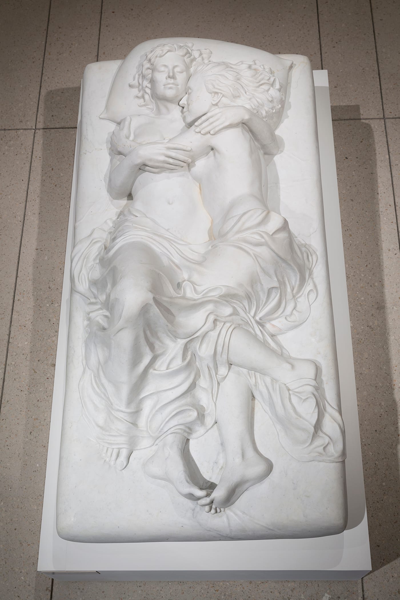 In a second space, the museum revisits Cronin’s past, including her most well-known work, “Memorial to a Marriage” (2002), which the artist created as a funereal statuary for herself and her wife, artist Deborah Kass, 15 years before the Supreme Court legalized gay marriage. Inspired by neoclassical sculpture, this composition of two lovers resting in each other’s arms is potently political as well as unapologetically romantic. In the same room, Cronin’s many watercolors depicting the works of Harriet Hosmer, the most distinguished female sculptor in the United States in the 19th century. Paired with two heads of infants by Hosmer, Cronin’s paintings, such as “Tomb of Judith Falconnet” (2006), capture the technical skill of the original while looking at it from a contemporary perspective. Even more persuasive are her more abstract works or “Ghosts,” shadowy renditions of Hosmer sculptures that are no longer in existence with no visual record to be found.