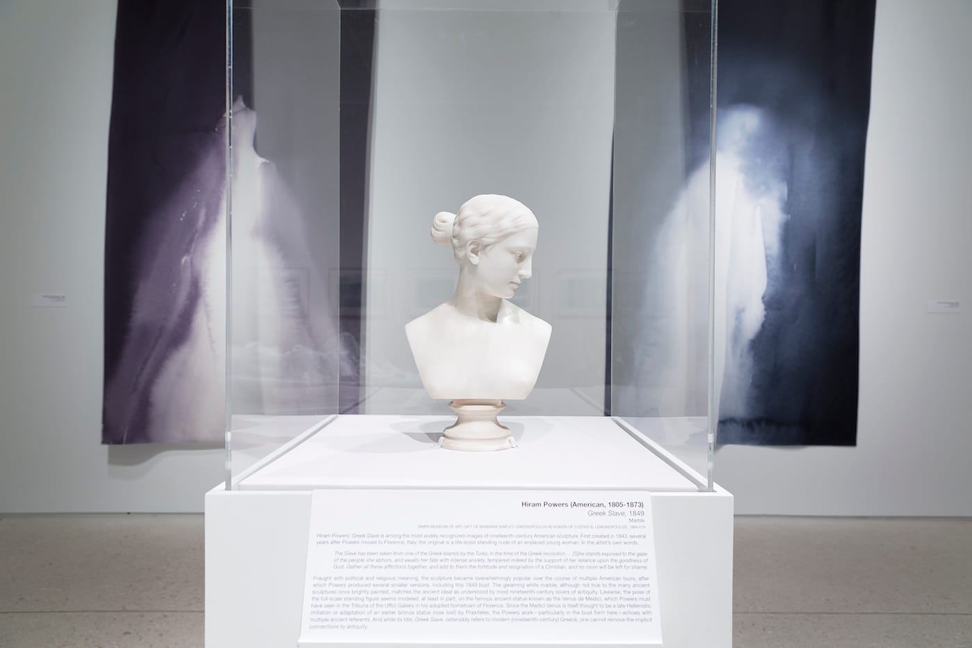 “Aphrodite Reimagined,” a towering 10-foot-tall statue gracing the museum’s outdoor balcony overlooking the Hillborough River, is the artist’s vision of the goddess, inspired by a fragment of a marble torso from 1 AD in the museum’s collection. Recreated on a larger-than-life scale in cold-cast marble, the torso now has a head, arms, and legs fashioned in resin the pale shade of aquamarine blue, like beach glass. Mimicking the drapery and posture of the original statue, Cronin’s version reads as both ancient and modern simultaneously, allowing contemporary viewers to gaze upward at the classical figure just as ancient audiences once did in columned-filled temples.