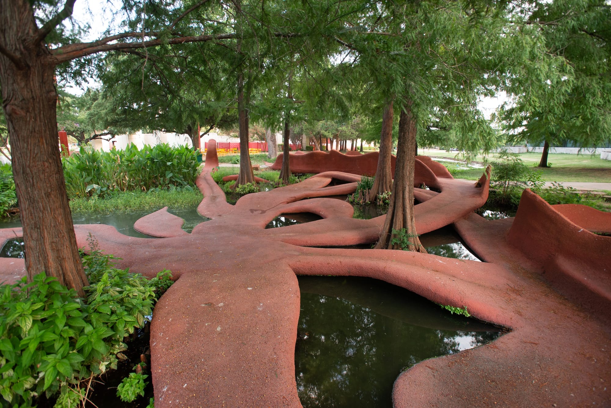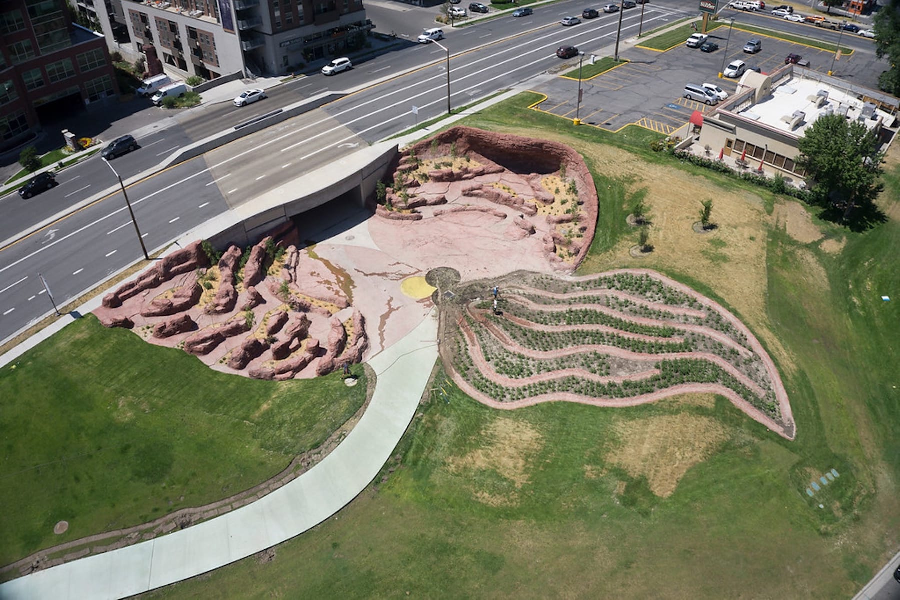 Some of her best-known works include “Fair Park Lagoon” (1981–86) in Dallas, Texas, which consists of two massive sculptures on the banks of the Leonhardt Lagoon, and “The Draw at Sugar House” (2003) in Salt Lake City, Utah. The latter features two large-scale sculptural works and allows floodwater from the basin in Sugar House Park, where it is installed, to safely drain into the nearby creek by flowing underneath the local highway.