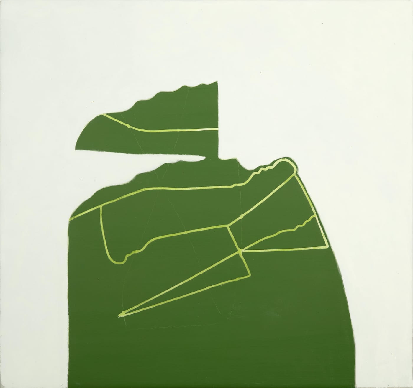 The central motif is a wing-like shape connected via a narrow conduit, or neck, to a larger, blunter form that could be read as a mountain or a torso. In every picture, this configuration is isolated, like a cutout, against a milky, monochromatic, greenish-gray field. Within these constraints, just about anything can happen.
