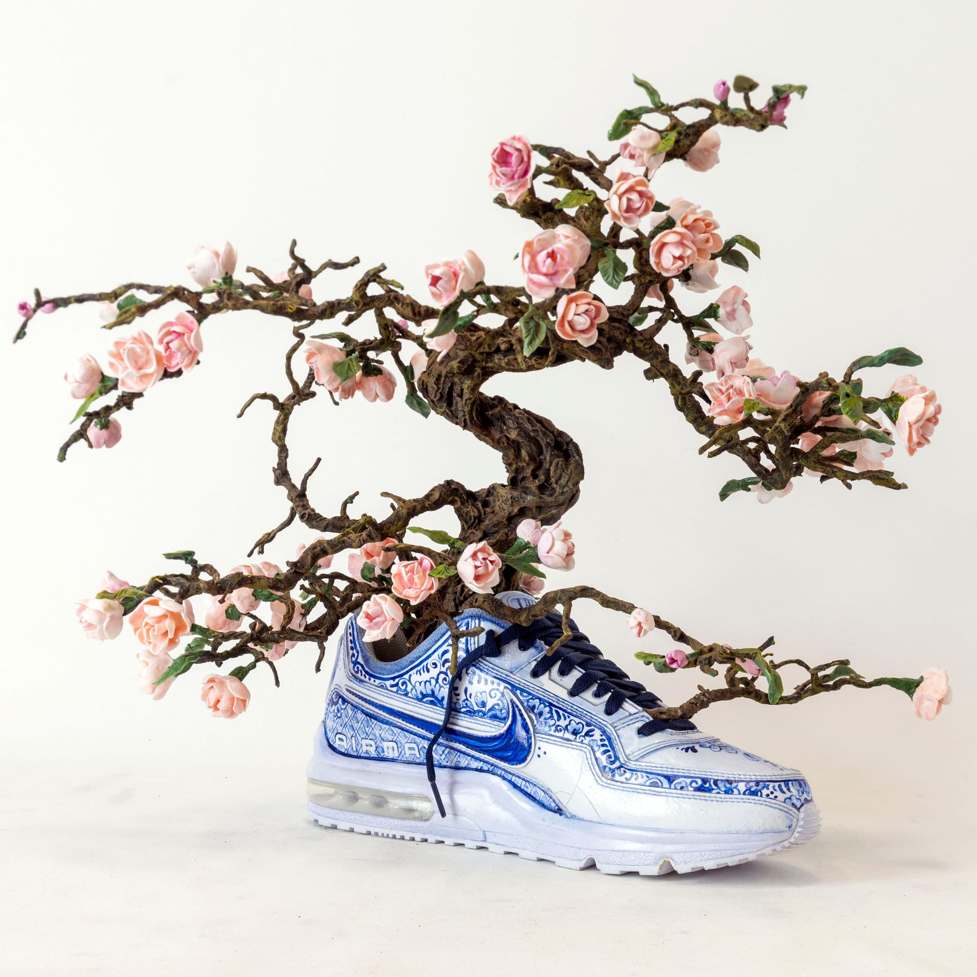 In other works from this series, Bergsma isolates his elements, creating unique vessels, such as a Delft blue-style Nike Air Max shoe, or psychedelic “melting” porcelain that appears to merge the vessel with the free-form botanical element with no foliage necessary.