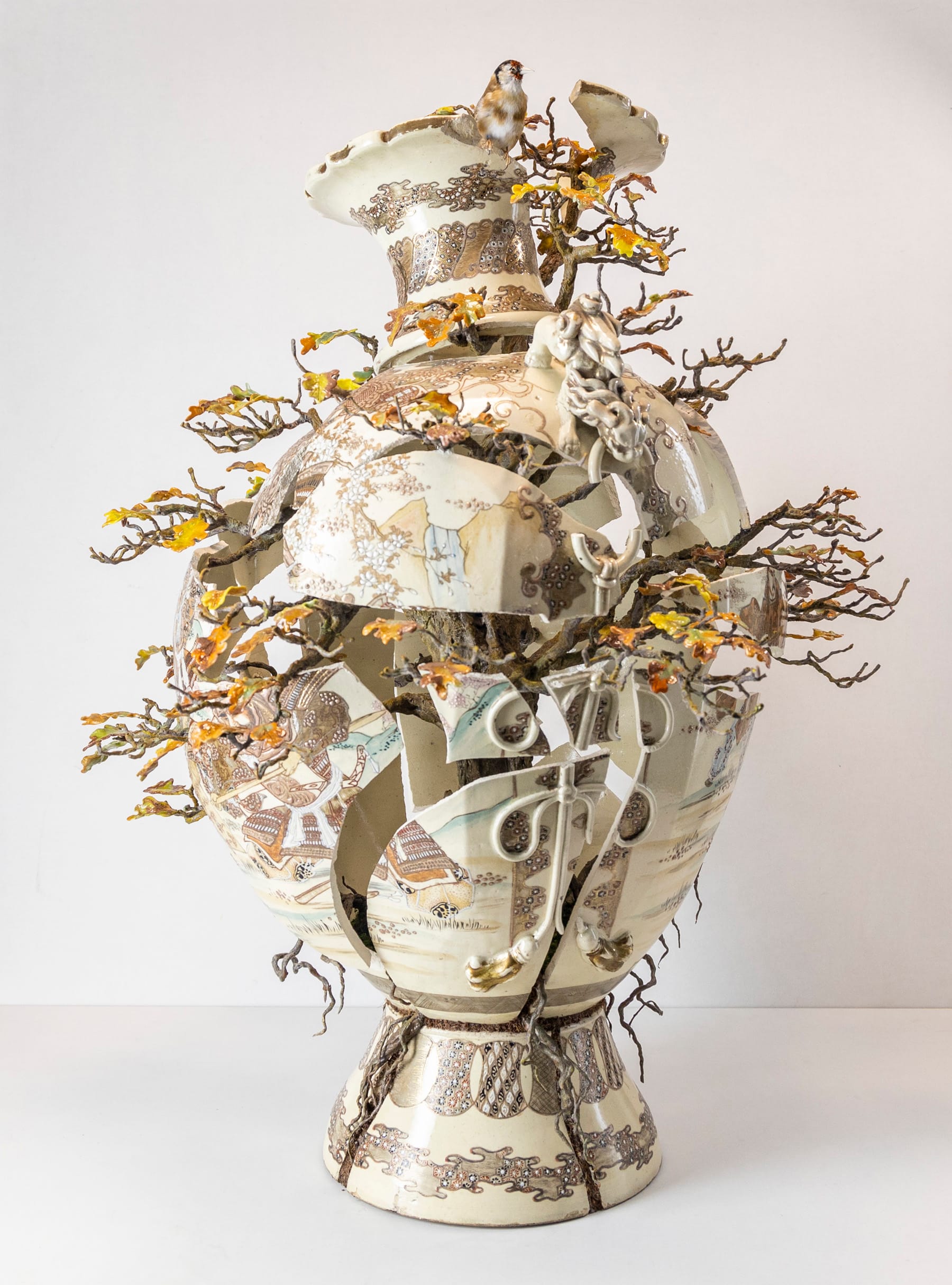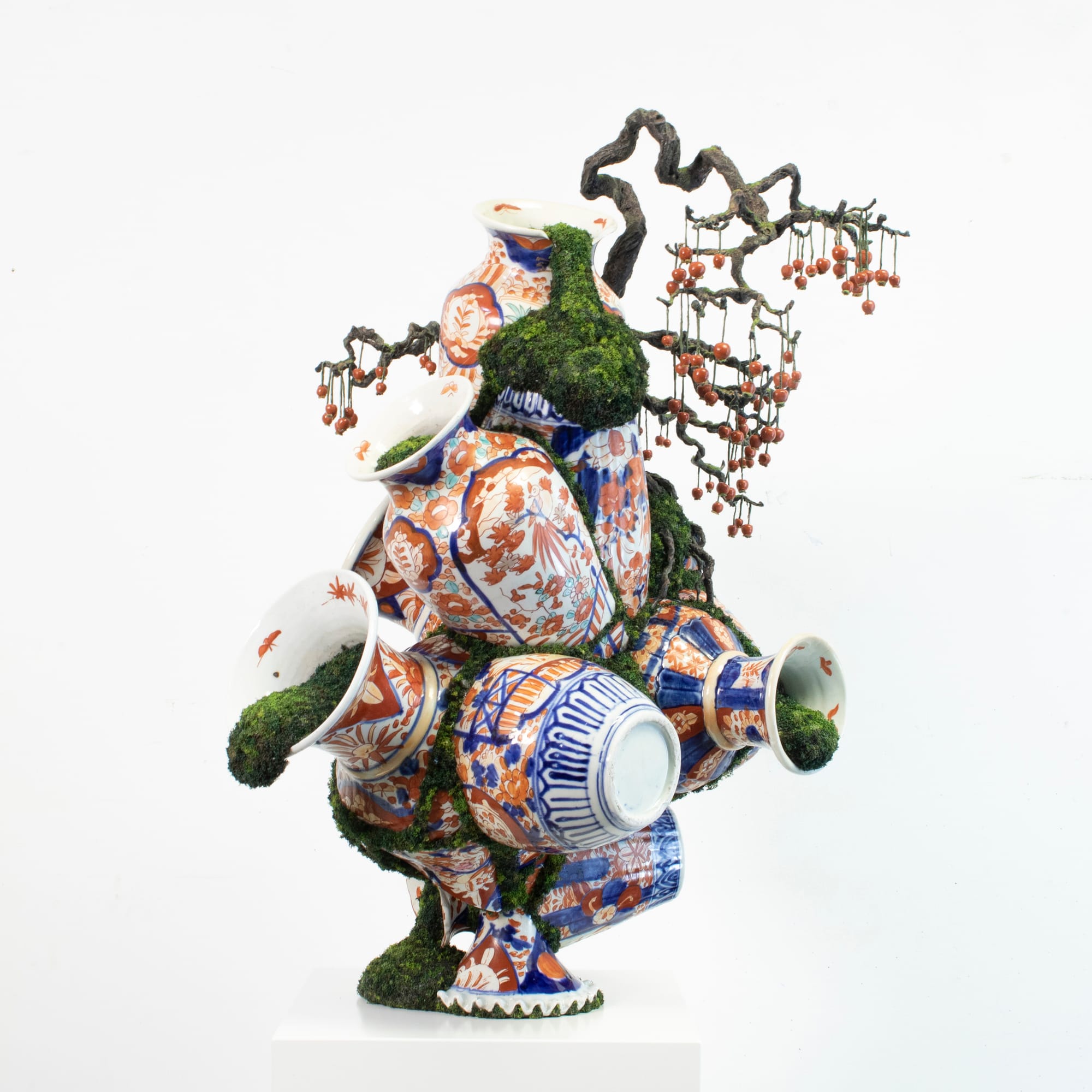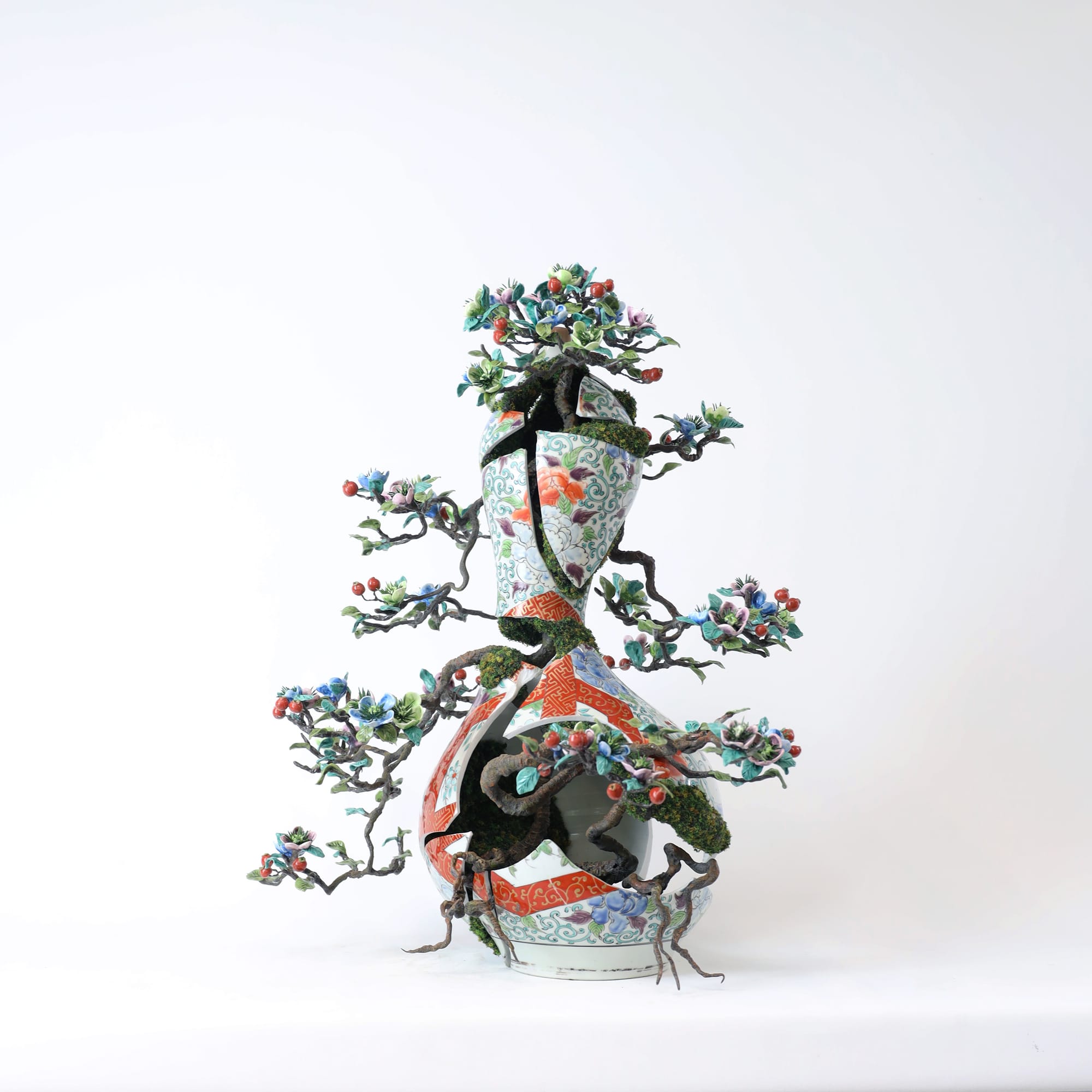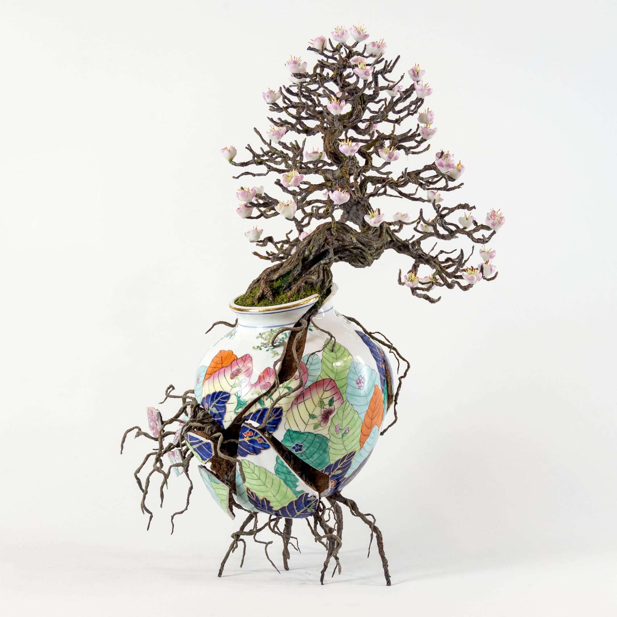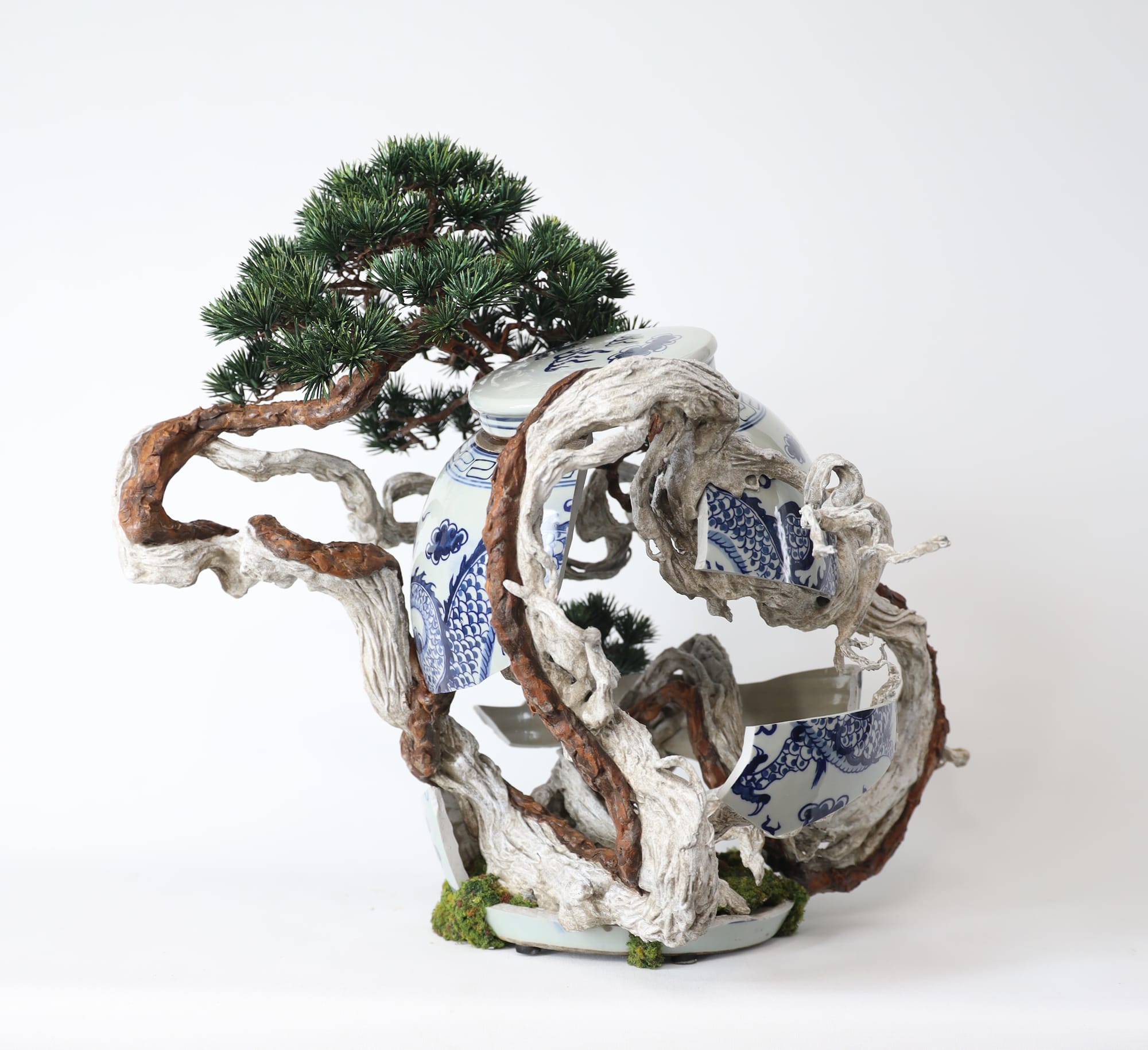 Inspired by the Dutch tradition of Delft blue pottery that imitated Chinese porcelain, Patrick Bergsma incorporates handcrafted bonsai trees into his exploding works.